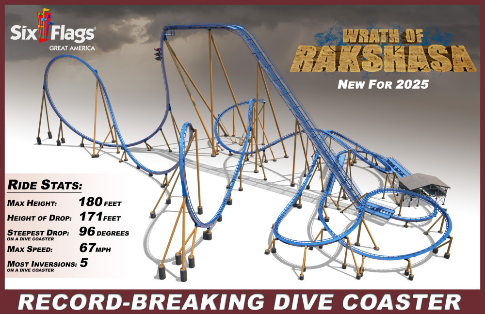 Six Flags has announced a brand-new B&M Dive Coaster will be added to Six Flags Great America in 2025! Wrath of Rakshasa, from roller coaster design experts at Bolliger & Mabillard, will be unleashed in 2025, shattering multiple world records. Riders will test their limits on the ride’s beyond-vertical, 171-foot drop, the steepest of any dive coaster in the world. But the initial 96-degree drop is just the beginning as Wrath of Rakshasa reaches speeds up to 67 mph, shattering a second world record with five total inversions, the most of any dive coaster in the world.