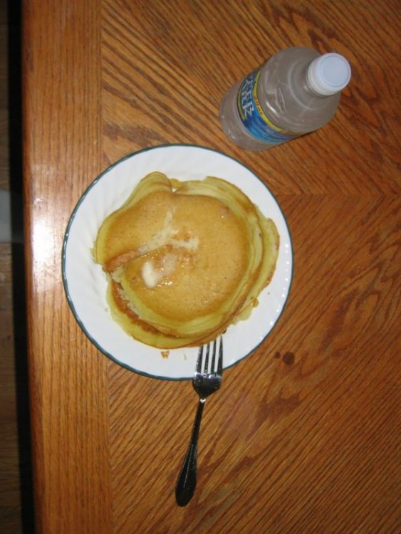 I ate pancakes for breakfast. I also took pictures of my breakfast! This is a picture of a plate with no food on it and an empty bottle of water! This was my food when half of it was gone! This was my food before I started to eat! -