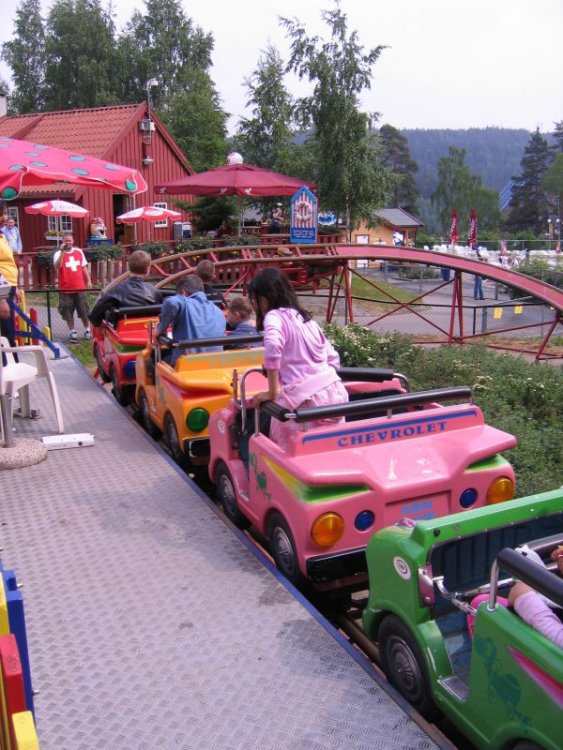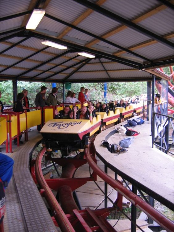 June 19, 2006 - Tusenfryd I'm glad I rode Speed Monster first because it wasn't running during ERT. After rode it I got all the other credits including the water coaster. The ERT on the Thunder coaster was during the rain. It’s a great wooden coaster and it’s even better in rain. You have to go down a escalator to leave the park. The last powered coaster on the trip. I didn't get very wet on this coaster. Teeny-Weeny aka a very small coaster! Its time for the Vekoma seat. Thunder Coaster was one of the best wooden coasters on the trip. The trains on Speed Monster are short. I'm glad I waited since Speed Monster was closed for ERT. You ride up an escalator once you enter the park. We arrive at Tusenfryd after a 4 hour coach ride. -