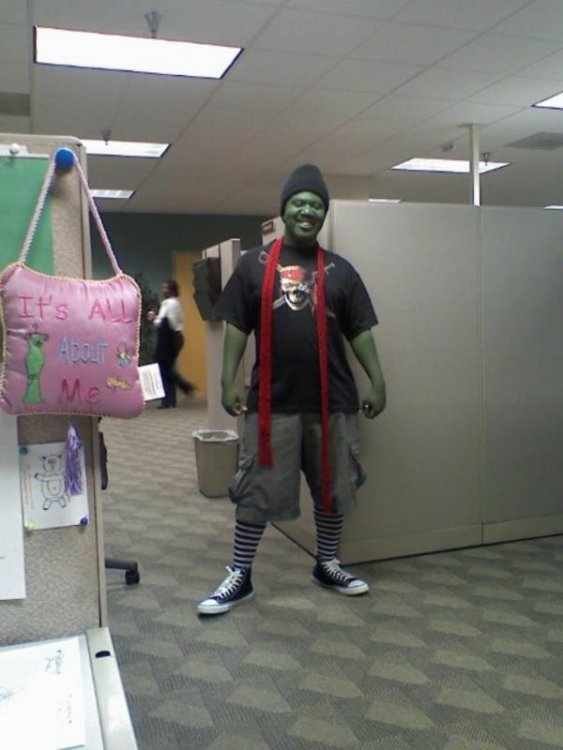 Here are some shots of me w/ a coworkers camera phone! This year I wanted to be original so I went as the son of "wicked"! I wanted to take the "what if elphaba (the wicked witch) had a son" approach to halloween this year! I had to initially make a sign saying I was the son of the wicked witch of the west and "I ain't no Shrek or no Hulk!"