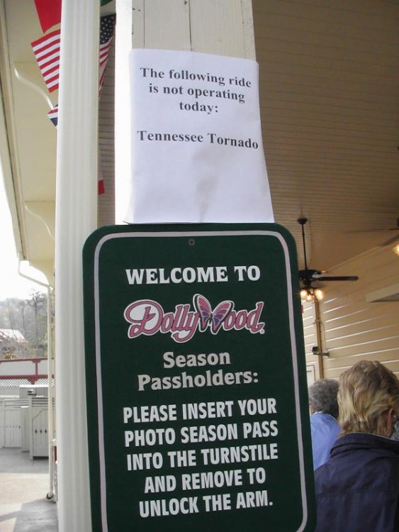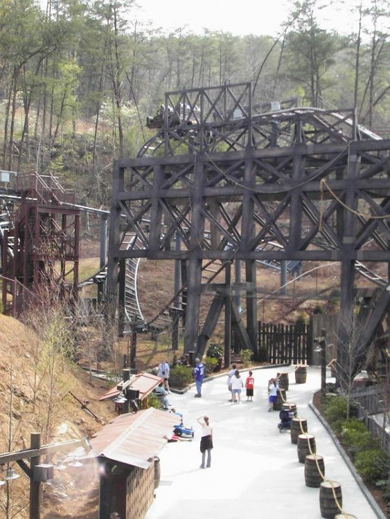 Well I decided to take on the task myself and get pictures of the ride in action since all 34 of you guys that have ridden it forgot to do so with the exception of dave! Overall, I really enjoyed the coaster. It was what the park and the south needs because between that, thunderhead, and goliath...the south is on the rise. Im gonna cut the bull and just give my opinion on different aspects of the ride. Also i'm going to give slight details for those of you who want to know a little about the ride. Station: I give this a 9/10. I was blown away at the detail that went into the station. The station virtually had no full wall and you can see thru the cracks of it! The station is full of props like dynomite and crows that really get you in the mood. A plus is that there IS a single riders line, however it starts right in the station. The loading system is awesome. Think sheikra meets Revenge of the mummy. Be warned the song...WILL get stuck in your head . The reason why the station isn't a 10/10 is because while the front part is enclosed the back is open up to the rest of the park and it kind of takes away from the feeling of being in an abandon mine but not too much but it would be better if the ride had to make an enclosed turn into the station so it could be completely dark...which brings up another point. The station is virtually dark and has some cool flicker style lights. Theming: Honestly, cant really judge that because they are still doing trail and error testing BUT from what was working today I have one word...WOW! The dark ride section is can say is ROTM meets the deep south! While I didn't see any animatronics...well not totally true there was plenty sound effects and of course everyone knows about the screen on the last lift but they dont know about the... ! The tressel really suprised me. I wasn't expecting it to be as large as it was. One thing I noticed is that the actual "theme" of the coaster isn't obvious. I think with some monitors with the old fella talling the tale of the mine would really give it that disney/universal edge! Coaster: I give it 8/10. This ride has to have the best beginning on any coaster I have even been on and thats the end of that. Also the best/worst ending. Let me explain that. The ending is amazing in one breath but in the same breath you can say "is that it". I feel that another helix or some element after the half loop would have made this coaster much better instead of just the brakes. But everyone that I rode with loved it especially when it seem like the.......then starts creeping (like im really going to tell ya lol). That freaked out alot of people! Also, the first vertical drop is short but DANG its something nice! Overall I really, really did like this ride. Now its no "drop everything have to run to dollywood" coaster it comes very close to it. And dave did mention it but it did have some blocking issues which caused the operations to cease for a while but it came up and they were running all 7 trains w/ minimal stacking. And dont let the lenth of the line fool ya because there arent any switchbacks in the station and the line moves really quick. I got there to the front gates around 11 this morning and was off the coaster bt 1130 and thats with about 3/4 of the que occupied. I had to use my camcorder as my camera since mysteriously I cannot find my digital SLR (yeah im gonna have to fork over another 600-900 for a replacement if I want to continue to make money) but here are some semi-good pictures enjoy! Here are the videos...one doesn't have a spoiler the other does! Enjoy! Oh yeah one more sign! Twistage! Moving right along to the second longest line in the park, Aunt grannies! If you ever eat there, request Jan and tell her jarvis, the black guy recommended her! Damn blocking issue...well atleast it wasn't hot outside for those lucky folks! Not smiling anymore...wanna know why? Thats what the trains should look like lol... Ok these signs are getting old...like anyone in tenn can read anyway lol! Upclose and personal...if you want to get the same feeling I had, lift your monitor above your head... Lots of signs there bo! Zooming back into the mine! He slept the whole day... Here we have the sleek, top of the line "your too damn fat" indicator implemented by the top scientist in the world...now if only people would use it! Yep...still smiling! She be comin' round der mountain when she comes... Trust me...it looks even better in person! Clear! themeing that isnt locked up in a cage! more signs... They actually QUIT their jobs to come ride MM today... That is one sweet drop! Weeeeeeee... Lets play spot the mine car. Dollywood is sexus!!!1!! signage Once you get to the top the wait is virtually over... overview of sign on the wall Pretty cool element. ...Smiling because you have to read about it and I got to ride it! (Notice the "hair control" lol) even from this point I waited no more than 20 minutes. overexposed shot...I miss my camera FINALLY this shot WITH a train! Where did that come from? In other words...dont go to guest services and complain that you didn't get to ride because it was down for the rest of the day! That sign is fulling up very fast! giving the run down at the gate! A ride not operating at dollywood! The slow losers who had to wait on another tram...forget it old lady I have to ride a mystery mine! Trying to do anything to keep myself awake! early morning and I had NO sleep except when I was driving...very dangerous!