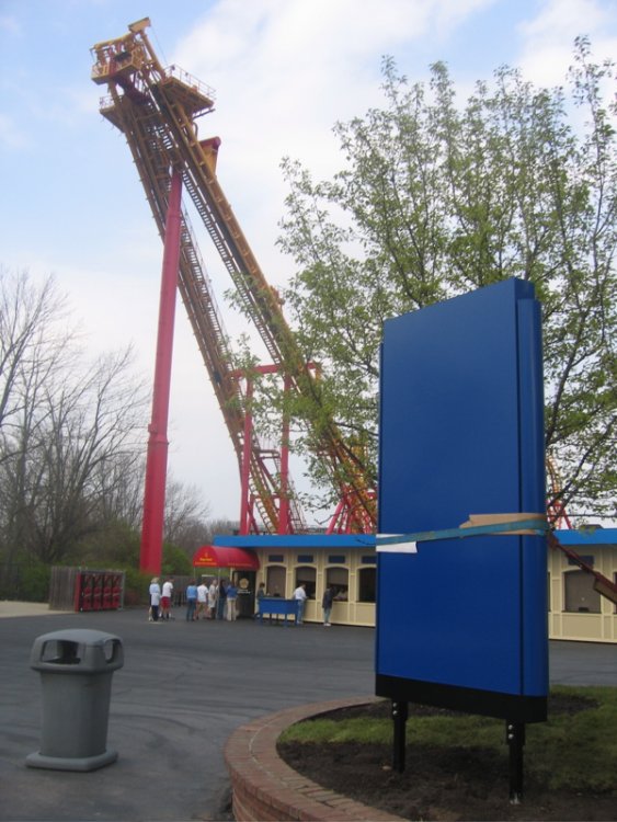 More KI Fun... Vortex was testing. Happy 20th Anniversary! FIREHAWK, formerly located at Geauga Lake, then the Kings Island parking lot, is just about a month away from running again. A nice semi-panoramic shot from the vast parking lot... Cedar Fair must not like chain-link fence as much as Paramount did... One last look back, with the flag at half staff in memory of those lives lost at Virginia Tech. HUH? WHAT? WHAT IS THE NAME OF THE PARK YOU SAY?! The new (blank) Cedar Fair style Park Information sign is in place. And something else for you Vekoma lovers... Kings Island. The Official Theme Park of the 7 1/2 Floor. Ahh... the infamous photo-less season pass... now MINE! The Season Pass Processing Center is a part of (P)KI history...