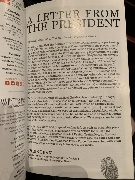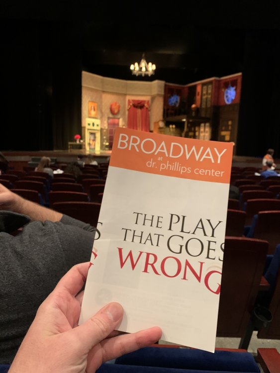 Tonight we got to see the third show of the 2019/2020 Broadway In Orlando series - "The Play That Goes Wrong" at the beautiful Dr. Phillips Center for the Performing Arts in Orlando. This show won a Tony Award for "Best Scenic Design In A Play" in 2017... and the set in many ways is the star of the show! From the official website: "What would happen if Sherlock Holmes and Monty Python had an illegitimate Broadway baby? You’d get The Play That Goes Wrong, Broadway and London’s award-winning smash comedy! Called “a gut-busting hit” (The New York Times) and “the funniest play Broadway has ever seen” (HuffPost), this classic murder mystery is chock-full of mishaps and madcap mania, delivering “a riotous explosion of comedy” (The Daily Beast). Welcome to opening night of The Murder at Haversham Manor where things are quickly going from bad to utterly disastrous. With an unconscious leading lady, a corpse that can’t play dead, and actors who trip over everything (including their lines), it’s “tons of fun for all ages” (HuffPost) and “comic gold” (Variety)—sure to bring down the house!" While I am generally more of a musicals fan, I do enjoy seeing an interesting play now and again. If you love slapstick comedy, laughing out loud and some pretty interesting stagecraft, this is the show for you! It essentially is a "show within a show" and the cast is incredibly talented at pratfalls and physical comedy. The stage itself is an "actor" in many ways and you find yourself wondering what it is going to do next! "The Play That Goes Wrong" is part of the Dr. Phillips Performing Arts Broadway series, which you can find more info about here: www.drphillipscenter.org/ Tickets are available in Orlando through December 8th. And if you're interested in seeing the show while on tour in another part of the country, Off-Broadway or in the West End, you can visit their website at https://broadwaygoeswrong.com/ . It is on tour through May 2020! Every time we visit the Dr. Phillips Center, we are reminded how lucky we are to have such a world class performing arts center in Orlando! Obligatory photo! I like that the program has the "story within the story" for the show! There were quite a few funny moments in this show! The entire cast was very talented! The show really showcases physical comedy - if you are a fan of that, you will be happy!