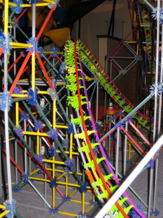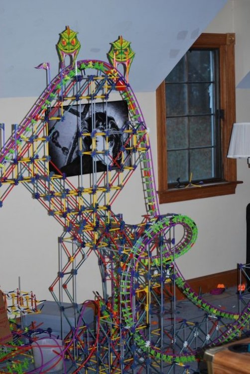 OK! So after my first attempt at uploading pictures a different way...I came out a failure. So I just returned to the normal TPR way. For those of you who don't know what I'm talking about....don't worry about it. This coaster is FINALLY done...and here for you to enjoy. I took a bunch of pictures today, but if you would like me to take more....I am more than happy to do it. It is a fully working model; lift hill and all. The train glides a perfect speed through the station and makes the full circuit. When I completed the circuit I KNEW I needed to have the chain work some how. So I strung up 4 K'nex motors and even they weren't strong enough to carry the train up the enormous lift hill. Ugh...what the hell. The chain wasn't even budging with the train on the lift hill. Desperate to find a motor in my house that could deal with the weight of the chain and the train, and work against gravity, yet have a low enough RPM to spin the gears, I set out on a search. I took apart my mom's Kitchen Aid mixer and found the motor in there to spin much too fast. Then I turned to an electric egg beater...NOPE fail again. I stumbled on a battery powered screw driver and thought...This is perfect!!! So I jerry-rigged a system that worked to carry the train up the hill Cliff Notes: I have a really fast chain because of an electric screw driver...but it works perfectly. Hope you all enjoy the coaster, because I had a great time making it. I hope I can put together a video of the raw coaster in action some time soon before I head back to school. Quick list of the elements... 1. 6'6" first drop 2. 4'5" immelman 3. Sea-Serpent 4. High Speed 90 Degree turn 5. Final 360 degree helix. ENJOY!! Now just onto the coaster as a whole. Interesting view of the sea serpent. Banked turn once again This is the 90 degree banked turn leading into the helix. Another similar view of the helix. The finale element of the coaster before making its way to the station is a 360 degree helix. I was seriously running out of pieces when I built this, so I did what I could. This is about as much of the coaster as I can fit into a single photo. Its super long and if I moved further back in the room, there wouldn't be enough detail. After the banked turn the coaster travels into its final element..... Quick overview of the first drop again and the sea-serpent. Upon completing the sea-serpent I needed to find a way for the coaster to make its way back to the station, and keep a relatively small footprint. So immediately after the two loops, the coaster speeds into an elevated 90 degree banked turn -