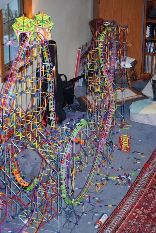 Ok so I just finished the coaster. I'll post an official update tomorrow when I get around to taking pictures of it. I finished it much much earlier than I originally thought...and was glad that I had just enough pieces. The last helix is sparsely supported....but it completes the circuit. The lift hill is 6'4" and the K'nex motors are not strong enough to pull the chain and two 4-car trains. I tried rigging 3 up together, but that was a total disaster. Tomorrow I am going to fiddle with a motor of some sort to get the whole thing running by itself. But as of now there is a hand crank you can use to get the train to the top of the lift. Thanks to all of you who took the time to look at the design. Pics sometime tomorrow. It's currently 2:10 AM here on the east coast.....maaaad late. -