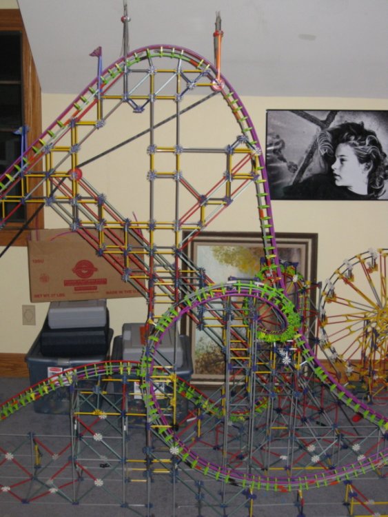 **Update** Ok, so I wasn't able to post an update yesterday...but I got some work done in the past day and a half or so. After the immelman the track comes down to the ground, and then rises up into a sea serpent. (thrillrideseeker...I used your idea!!!!!!!!!!) I had to get sorta creative with the supports, building the track through the lift hill so I didn't have to build up from the ground. So far everything is going well. Excuse the mess. When I build pieces are scattered everywhere. They will be picked up upon completion. If you read this...leave a comment!!!!! Trying to find out what to do next. Also, any ideas for names??? Another view of the sea serpent. Overview of the sea serpent. I may need to boost up the supports on the second inversion because the structure shakes slightly when it travels through. Shot of the first drop with the sea serpent snaking its way around it. As you can partially see in this photo, I used many of the pre-existing supports of the lift hill to support these inversions First half of the sea serpent. The other inversion is tucked away behind the other supports. Overview of the entire coaster so far. It is at an awkward angle....but it's the only way I could fit the whole coaster in the whole frame. Completion of the immelman. -