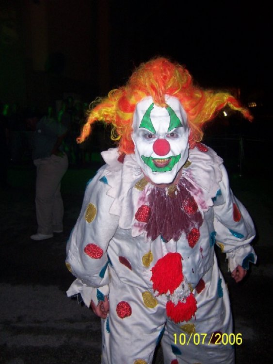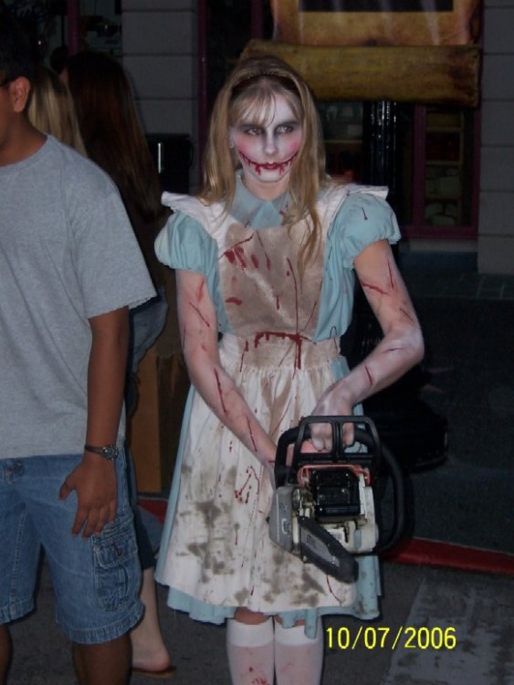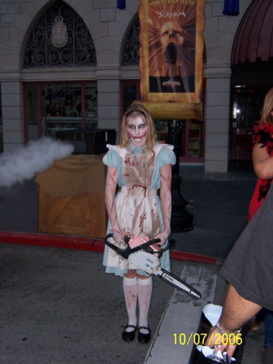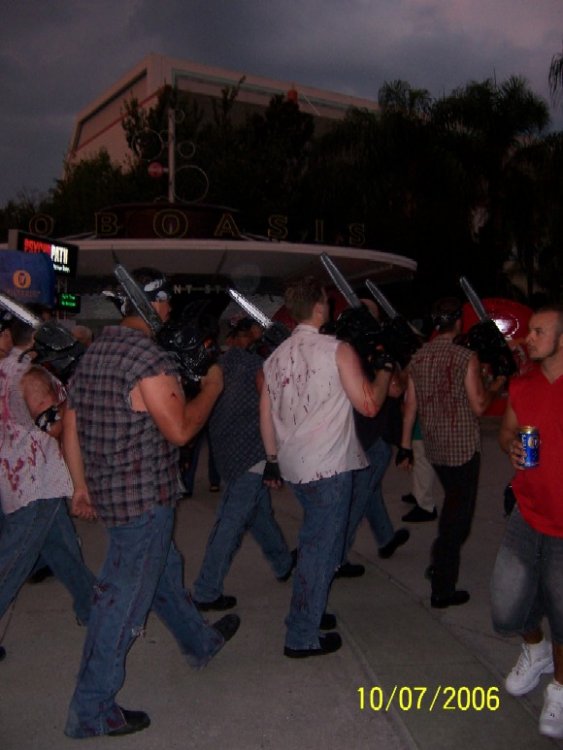 17. Okay, went to Halloween Horror Nights Orlando on October 7th. Let me apologize up front, I took a million pictures, but these were the only ones that turned out. We did the parks all day, then came to Halloween Horror Nights after dark. It made for a very exhausting day, but had fun. My Brother was down from up north, so I wanted him to see all he could. Universal Studios closed at 5 pm. Then opened back up for HHN at 6:30. It started off a bit slow. But once the sun went down, it all opened up. I think it's a bit better that it's only on the Universal Studios Side. Everything was a bit more compact. Therefore, giving you alot more bang for your buck I think. We got the fast passes online about a month ago. I really didn't want to spend that kind of money. But truth be told, it was worth it. I have gone in the past, and it was an average of 2 hours wait for some haunted houses. With the fast pass, I never waited more than 15 minutes, even when the signs would say there would be a 200 minute, that's right, 200 minute wait for the regular lines. The fast pass also got you onto the rides at the park, which most were open all night long. And the bill and ted show, you get up front seating for that as well. Bill and Ted was awesome this year, as it is every year. They show it like 5 times each night, so, if you miss one, you have plenty of opportunities for the other times. I also liked the haunted houses this year. Having the old ones back again worked very well. The only thing I would change is that they didn't have enough "Scare Zones". Aside from that, well worth your time. Okay, I feel the need to say this. If you drink, don't be stupid. The staff on hand had VERY LITTLE patience for drunk people. And trust me, there is alcohol everywhere. I personally saw at least 2 people being escorted out of the park. To include one "heckler" who was picking on the girl that opens up the Terminator 2 ride. So, all you booze hounds, you have been warned. I will be going again on the 14th, with a different group of friends. I will try to get better pictures this time. Might actually have to read the directions for my camera. I will also be going to Busch Gardens Tampa Howl-O-Scream Friday, I will have pictures for those as well. If you want really good pictures of Halloween Horror Nights, there is one from Jarmor I believe, that is also on the posting page. side view, he was waiting in line for psychoscarapy This guy was hilarious and Scary, all at the same time Lines were long if you didn't have the fastpass. Follow the signs Lots of fire, everywhere. Awesome show, as it is every year Bill and Ted's excellent show One of the few haunted walk ways Off to make trouble. I don't see any trees anywhere, what are they doing? You talkin' to me? Try carving this one Wow, I am really short tonight. Don't let the chainsaw fool you.... Need a date? City Walk Lit up