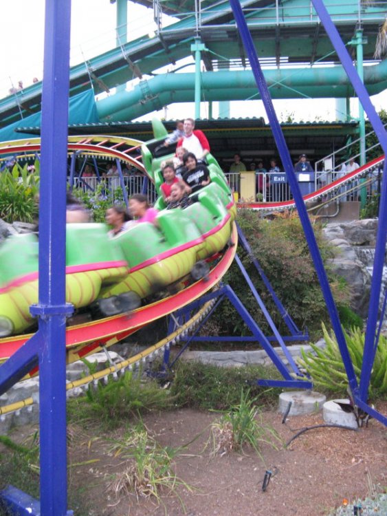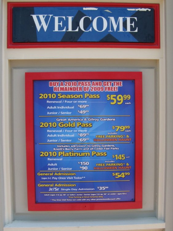 10. California's Great America - Day 3 Today was a day of getting all your credits and get out of here. No kidding we did leave early but we voted to leave early and I think everyone agreed. I didn't knew much about this park except that it was used in Beverly Hills Cop 3. Pictures.... That lifthill is definitely not straight. Catch the blue train. Ok thats better. Come on peeps show some exitement. TPR people in coaster heaven. Empty train speeding by. Coasternerd taking pictures of a coaster. And finaly Grizzly opened. Random picture from the sky ride. Bonus picture. Sorry guys I really hoped you got soaked. But when they arrived the water canons had technical difficulties. So I was already hoping that they would get soaked at this point. Paul asked me too guard his backpack while he and Josh took a ride on the rapids so whilst waiting I took a few pictures. Vertical loops are good. The first part wasn't actually that bad. Ah another death machine. And we're welcome at the picnic grove. I love the random train in the station pictures. Cause we are too. I wonder how many people of our group did fit on this coaster. Help don't eat me. with the smallest splash in themepark history. White Water Falls. Which is not so good for a B&M ride. Next ERT session was on Vortex. From a distance. I heard some people almost Blacked out on the helix after the loop. Looperdeloop. Very forcefull but I like B&M's that way. We started with ERT on flight deck. ---- 2009 prices. Entrance gate.