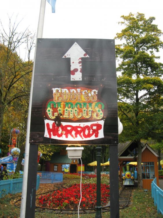 21. Ok here is my take on the Fright Nights at Walibi World. First off I don't want to be too negative about it but in comparison with the past years this was the worst Fright Nights I've been to. Somehow Walibi cut their budget and you could tell there were less actors than other years. I'll start my review with the worst maze and end with the best. 1. Eddies Circus of Horror. This was my favorite maze of last year. This year however they let way too many people in and I jammed for three or four time which killed the experience. There was too much light and too few actors. 2. Club Roxy. Like Benny said this maze has the most fantastic queue ever. You cross a bar for three times while in line. The maze itself was also a bit disappointing. We crossed five or six rooms without any actors. This maze has great opportunities and I hope they get it right for next year. 3. Alice in horror land. This is the best maze that Walibi ever had. You must wear 3d glasses and everything is very disorienting. It's clear that they put all their effort into this maze. Even with those minor disappointments I had a really good time. And I know those minor things wasn't an issue for people who visited the Fright Nights for the first time. Pictures. See ya next year Eddie. At least it was to me. The Beetlejuice show was very funny. This guy was acting very well. Two scare actors in one picture. The first time I saw him last year I LMAO. A little side note. In Holland there is a kids television serie starring clown Bassie. see picture......... In Walbi there is a bit of a Bassie rip off. See next picture. And most importantly there is a bar. The atmosphere is really amazing. Club Roxy queue area. Getting buried alive. She was still looking for a groom. This guy was really amazing. Meeting up with Eddie and the Gravedigger. Entrance of the maze. Note the security dude. He was chasing down two linejumpers and got them out of line and probably out of the park. Which is a good thing cause I hate linejumpers. But it wasn't too bad it took us about 30 minutes once the maze opened. Ten minutes later it almost stretched outside the park. We first got in line for Alice. We started queueing up 30 minutes before the maze would open and the line was already half way down the main street. It's already getting dark on to the Fright Night pictures. Respect for mister Wok. This ride can make you nauseas. Main stage where you could meet up with Eddie and The Gravedigger. Don't worry you'll hit the brakes soon. followed by this headbanging part. Back breaking. I feel a headache coming up. and soon disappearing into the mist. Coming out of the station. Putting in the second train. queueing up for Robin Hood. Food deal. This is the best way to ride Splash Battle. Xpress station/coasterporn. The original Riddler's Revenge colors coming through. Swing. I spot two trains. Off course some Goliath love. First we got the big rides out of the way. We're there.