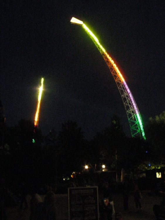 Hi everyone, It was time to hit the Geforce again. We stayed on an awesome campground in Bad Durckheim. Since there were summernights in Holiday Park and the park was open from 9 am till midnight we decided to rent some bikes so we all could drink. But it was really a stupid idea, it took us more than 2 hours (30 kms) to get to Holiday Park, and we had to go back in the pitch dark. Well we survived but we won't do that ever again. Let's get back to Holiday Park. It wasn't too crowdy and there was only a 15 minutes wait at the Geforce during the whole day. The Geforce was running like hell, well at least it did in the late afternoon. There were two times when I hardly noticed the trims. In the morning and evening you could feel the brakes but none of the rides I did felt the same. We did the rest of the rides in the afternoon and at night we drunk some beer and ride the Geforce over and over again. On to the pics. The End. We were really happy they let us on the last two rides of the day. Thank you Holiday Park. Flying by. Already closed here. Notice the rope. It's getting dark already. This picture is really about the carousel. Me on the front during the first drop. Waiting for front row. Most of the times we rode it in the back. Enjoying ejector air. For one euro you could spin the wheel. There were only two chances of getting a price. We watched it for half an hour but nobody did win. with some hot babes. On the Geforce area there was a DJ. Cause of the summernights there were several shows and music throughout the park. But that couldn't stop these people of getting in this boat. They just jumped in at this point. Cause of a thunderstorm passing by they stopped it. We tried to get on the logflume but it broke down two times when we were in line. We deserved it after that awful bike trip. Now it's time to get some beer. The pet dragon of the castle. After the raping and beating. They start a party. Sorry Robb. It's censored. I'm gonna kill you. Beat her!! Some slavery too. It's all about knights and beating and raping wives. We all could fit in one car. Nicely themed. There never is a line for this great darkride. One of a kind drop. The two girls upfront were so happy that I took this picture. Overbanked turn. Many people with their hands up. Thats the way we like it. We are really looking cool. Wow it seems like everybody is having a good time. They sprayed water on the track. I think it was to cool down the wheels or the brakes. Yeah the Super Wirbel. But it was so hot on that day that we dried in about 5 minutes. At least we did. You can really get wet on this one. ^ Donnerfluss cause I know "TheRapidsNerd" love those pics. The drop tower is themed differently every year - 2008 Olympics. I had to this one on my own. My mates chickened out. Thats more like it. Were are all those hands. Even that cloud got some airtime. Let's take of with some awesome Geforce pics. Wow that drop is insane. Ah were there. I didn't take any pictures on our horror bike trip. So we rented some bikes. Our field. ^ The campground was really huge. ^ We had lakeview rooms Here is our hotel for the next two nights. ^ So here we are heading for Bad Durckheim