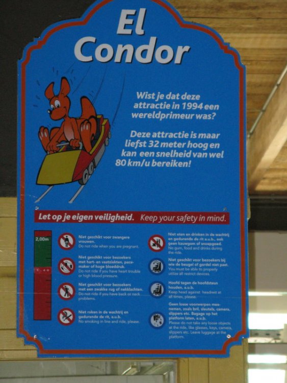 Just got back from Walibi World. It was a nice sunny day and light crowds. On to the pics. On our way back cruising from Lelystad to Enkhuizen. On the left Markermeer and on the right IJsselmeer. It should be open again in 2009. La Via Volt. SBNO for a year now. A small show that we were passing by. Ahh a hippo New playground in the kids area. When I took this picture I actually was getting high. There were two bimbo's next to me who were smoking pot. These are just a couple of random park photo's The DOU DOU slush drinks Xpress was also running on a one train base. Those last two pictures are taken from Rio Grande. This is better. From this spot you just can't get a good picture. Xpress the uncovered Rock n Rollercoaster See he isn't even halfway through and already soaked. Brave volunteers Nice overview Splash Battle a interactive water fight were you will get soaked The big turnaround There is some air on those hills. Don't know what but there must be something I guess there is something interesting on the left. And it broke down in the end of the day Robin hood was also running 1 train. Robin Hood wooden coaster presented by Vekoma Wheeee 3... 2... 1.... Launch These girls just finished their adventure on Space Shot Enough of the SLC pics. I did rode it twice today 1 upfront and 1 time in the back There used to be a lot of green in this picture but they removed a lot of it in the off season. In stead of the guy in the first row who is suffering of his first SLC headache Actually I enjoyed it It wasn't running that bad today. Yes its El Condor the first SLC in the world You now what time it is. 3rd drop with a nice overview and a few seconds away of getting wet. POV 2nd drop Thats a bit better Hey here we are but were not smiling. POV first drop POV first lift Random people They supposed to be funny. Some of the signs inside the station Last drop of the ride Overview of the logflume Crazy River This ride operator is the best. I hope TPR visits Walibi World in a weekend cause he only works on saturday and sunday. Station overview Nice view from the parkinglot Hey thats us Some kind of art and yes it was the green one It was only running with one train today. There is plenty of air on these bunny hops. Goliath was running great today well it always does. Yes Goliath I can see it now a bit better Hey what do I see in the back And I did big time You might get wet There was a bit of a traffic jam There they are Yes she is waving to me Entrance of El Rio Grande rapid river. He had to use both sides of the lapbar. Its a bit hard to take a good picture because you can't walk around this coaster. Overview It's Flying Dutchman Goldmine. But you probably allready read that. Mainstreet at the end of the day. A great orange Walibi on top of the world. Yes were there.