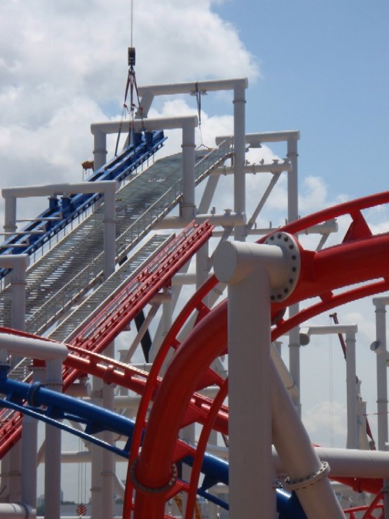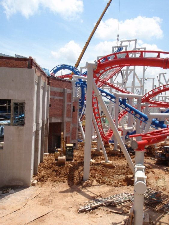 Came back from the construction site today ... with pictures. As I am only able to view from the back of the park as well as on the Sentosa Express (the monorail that runs through the site), I'm only able to get views of some of the attractions. Here are some of the pics. More lift hill. Does anyone think that the lift hills have LIM? The Cylon vertical loop will encapsulate the twin lift hills. After the vertical loop, Cylon will swing back over the lift hill for a inline roll (behind the station). View of the lift hills with supports for the cobra roll. Scaffolding to the right will be the facade of Revenge of the Mummy. Human brake run. Cockscrew of Cylon after coming from the soon to be installed Cobra Roll. Soon to be installed brake area for Cyclon track. Battlestar Galactica Duelling coasters. The red track (human) and blue track (Cylon) will interact at different points. More coaster track likely to form the cobra roll of the Cylon (blue) track. A view of the park with SFX theater to the left, the supports for more glass scaffolding and the Battlestar Galatica duelling coasters. Hollywood Boulevard. There will be a glass canopyh over it just like in Japan. The structure in scaffolding at the back of the photo is the replica of the Balboa tree in Journey to Madagascar. The outdoor section of Journey to Madagascar. Soon this will be behind the steel wall. This is the front view of the resort. You can see the family coaster the Dragon in red as well as the turrets of the Shrek 4D theater. -