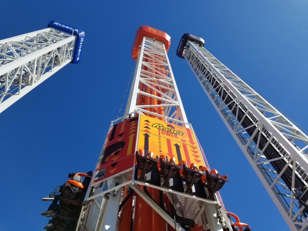 9. According to Hersheypark's Twitter, all three tower bases are in. Also looks like part of the ride vehicle is on the Kiss tower so far.