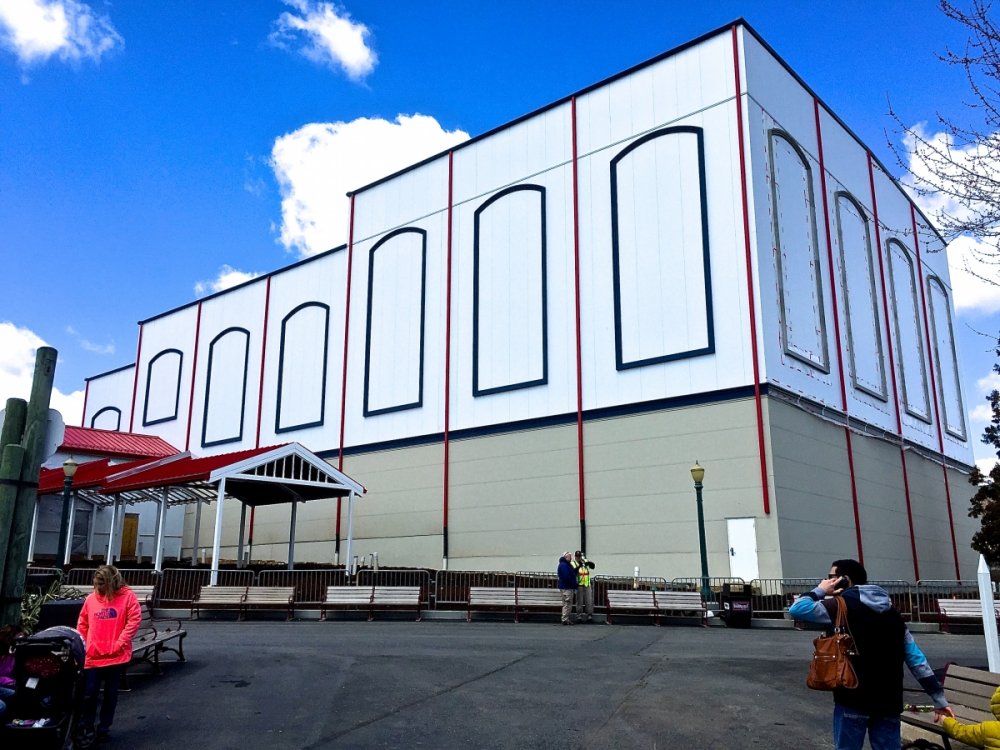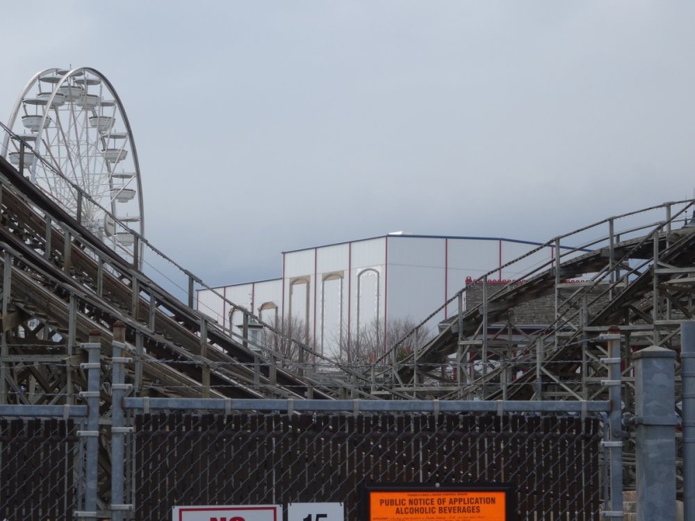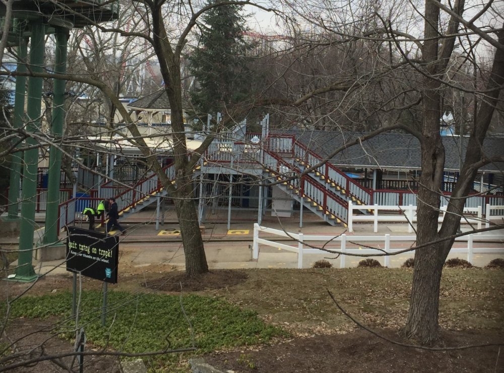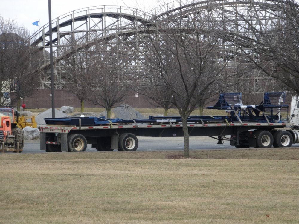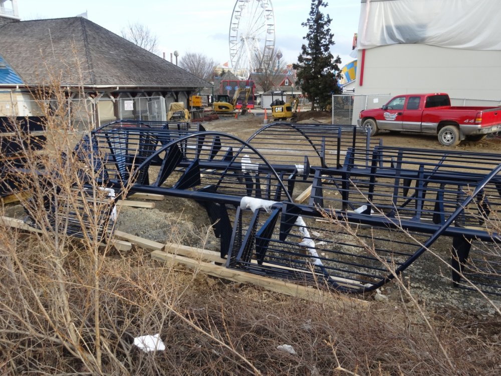 I went for a walk Thursday and got to see quite a few coasters testing for the season. Law Trakk's catwalks have arrived and the ride building is starting to get fancied up and it is starting to look like it will blend in with the Midway America theming. The park has also updated their 2015 page with two new shows being added for the season and two new locations where you can upgrade your admission ticket to a season pass. The food locations page was also updated with food items for the new Outpost allergy-friendly eatery. Some of the items include buffalo chicken pizza and sandwiches, southwest chicken sandwiches, grilled veggie sandwiches, cheese pizza, and some others. Overlook Food Court looks like it will have 9 concession locations inside the building and also feature three different types of mac and cheese, wraps, wings, salads, and pastas. A little sidetone on the Dance Dance Dance show; it seems that the park had a show with the same name in the late 1980s and early 90's that was pretty popular. Shiny new wood for the Chocolate House. Chocolate World will be expanding again this year. Storm Runner and Comet were just two of the couple of coasters testing yesterday. Peeking through the fence, Twin Turnpike's Sports Cars exit will share the Antique Cars side. Nothing really new at this end of the building. Special delivery! There are quite a bit of stairs, railings and catwalks. Spiral staircases. The curbing for the midway looks like it is going back in. Trim is being added to the lower portion of the ride building. Here is a closer look. On the park-side of the building, more details are being added and it is really starting to blend in with the area of the park. The Ferris Wheel is now back up, but it is missing its pin wheel so far. The park opens next Friday for Springtime in the Park. I'll leave you with a photo with Skyrush, Great Bear, and the first storm of the year. -