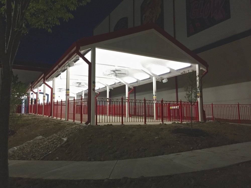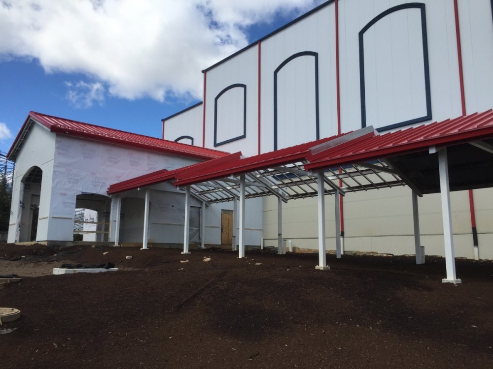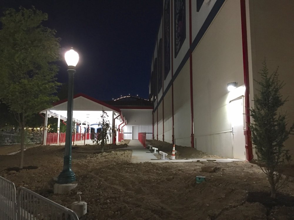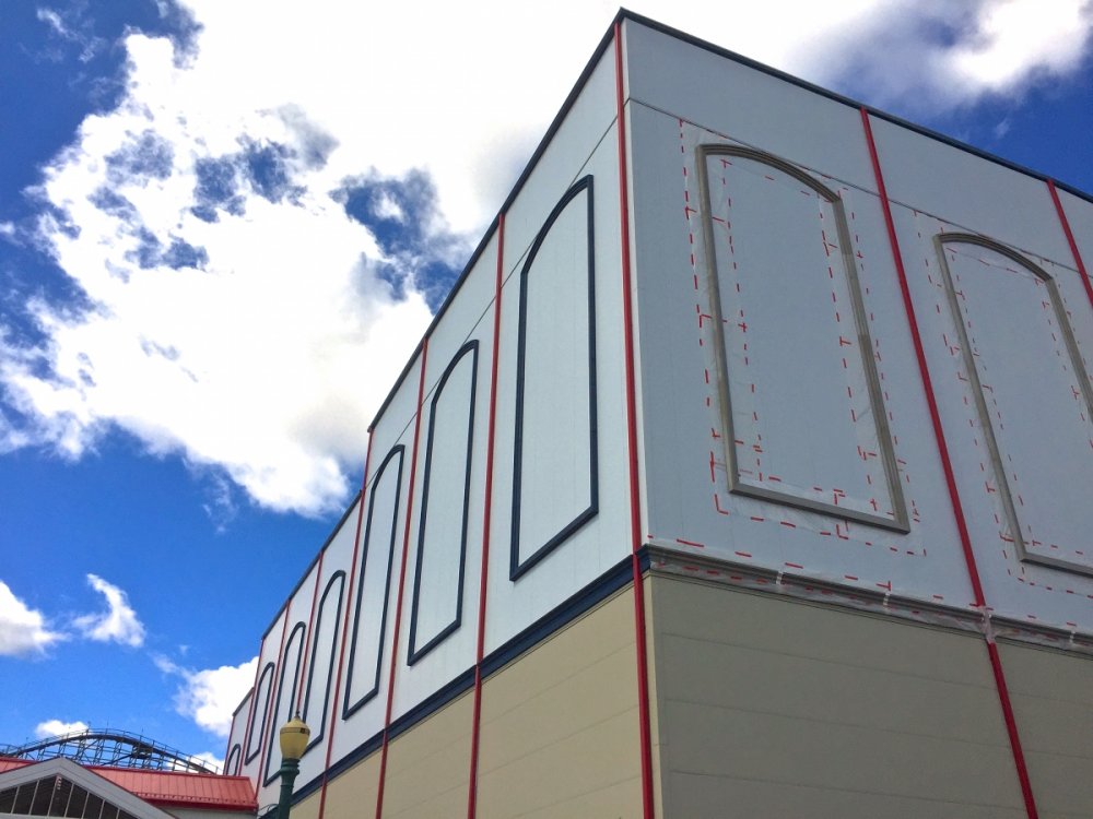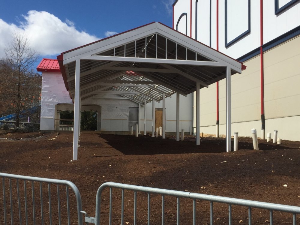 Looks like quite a bit of the ride is already together. They did add some dark blue/purple trim to the exterior of the building, but it is still mostly white for right now. The foundation for the two kiddie rides that are to be relocated may have been poured given that they have a tent set up in that general area. Once they do that, it will allow them to move the roof structures for them back into place and start work on bringing Tiny Tracks back in Racer's former overflow queue. Can't wait to see what the cars look like!