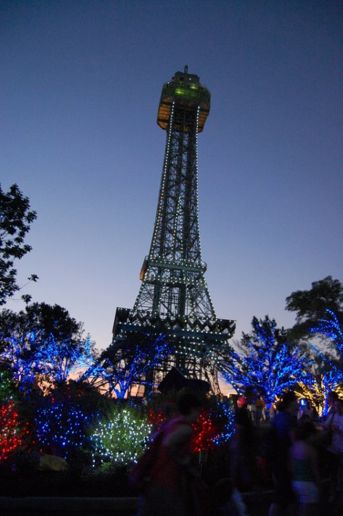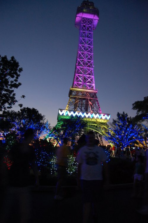 Hey TPR! Kings Island's Snoopy's Starlight Spectacular opened for the first time tonight. Took a few pics from the show tonight, and really enjoyed it. Tt was very well executed for what we have to work with. I assume everyone will have a different reaction, coming from "nice lights" to "not my thing" to "I want to come back tomorrow night!" It lights up at 9, with pleasant music. But the real show is three parts, all syncd to music and lit up on the backside of the Eiffel Tower. The first part is 5 minutes at 9:30, then part two is at 9:40, which is about 7 minutes, and the last part, about 3 minutes is at 9:50ish. It gives you a chance to look around the area (which is behind the Eiffel Tower), and then enjoy the Eiffel Tower show. I'd stick around in the evenings to watch this show again! So now we have three nightly awesome shows: -Starlight -Fireworks -Fountains KI at night is the place to be! It's hard to get everything in one update. There's tooonnnnssss of lights. These photos don't do justice! Especially the atmosphere of the area. The music, the lights, everyone around...stangely tranquil and relaxing. Enjoy the pics, -Zach Getting dark at Kings Island.. Watersplash...but no train? You can buy some type of 3D glasses...yeah right. Around dusk (8:45-9) the lights come to life! Strangely patriotic! They had a bunch of lit up characters (was focusing on the lights) Here's 3D for ya! Big pretty flowers The clock looks great! The lights change constantly This dull area now looks fantastic! When the show starts at 9:30, the Eiffel Tower really lights up Very impressive Clock all lit up Crowds really showed up I love doing this - now you can see which individual colors are here! Such a great atmosphere It was a great night, too I see you, Diamondback! Bubbles! Arguably the best addition to KI in quite some time! Tee Hee Play ball! Many shades of green The flowers start off closed... and slowly... bloom! Thanks for reading everyone! Go out and see the show! -