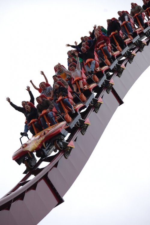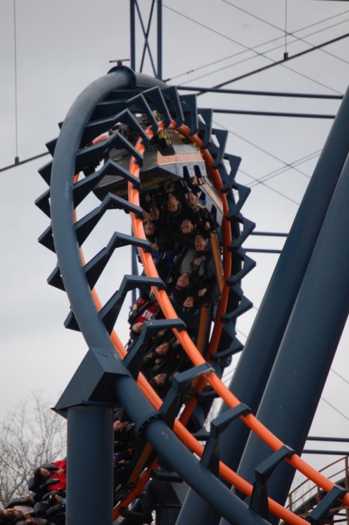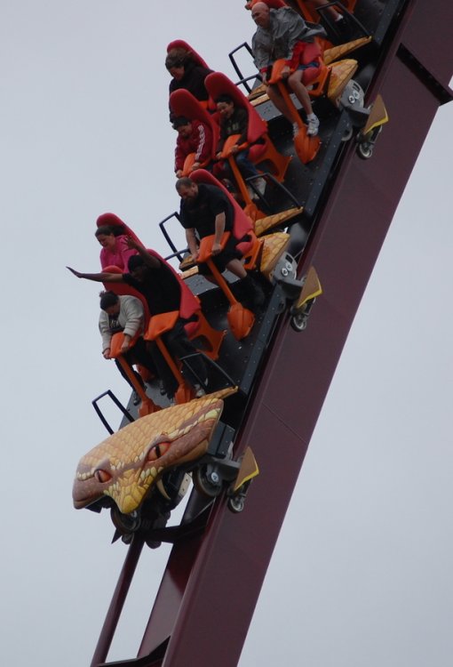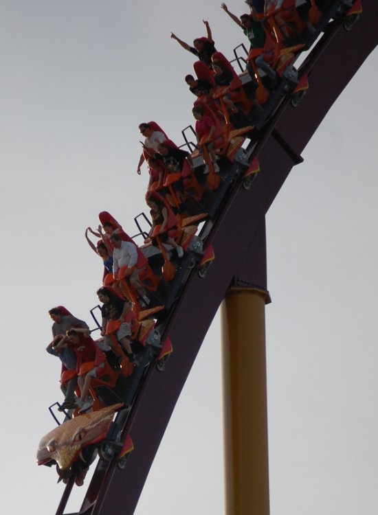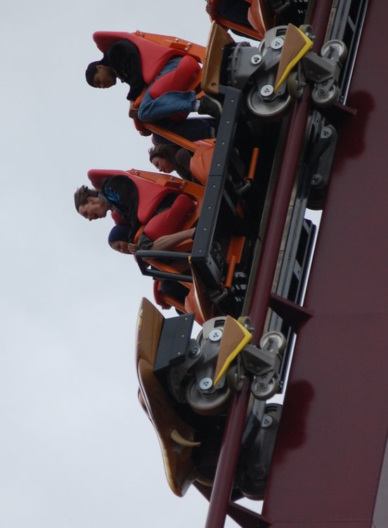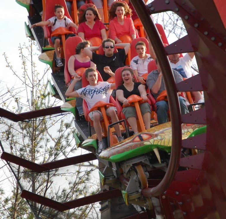 20. More photos....some non-DB stuff. But it's a fun ride. I wouldn't wait more than 15 minutes for it though.. But seriously...a year after it opens with brand new location, paint, and name....it looks like sh*t and is running a one train op. There's two switchbacks full before the station and it's an hour wait. Pathetic. You won't like me when I'm angry!!! Don't make me angry.. oh....we're at Firhawk.... Still pleasing riders! Racer still is going "vintage look" A new sign for the arcade.... Vortex looks great! KI could rip this off as a new show, starting every 3 minutes. Typical happy rider. Headless dude on DB! Or maybe he's playing peek-a-boo. Nnnggghhhhh rain doesn't feel good See, Moses...it's not that hard. I spy hair time! Dose wheel spin fast. SMILEY FACE! Hey...this looks like... Diamondback gets pretty close to the crowd. When your feet can't touch the floor...it really gives you the sensation of free fall Hold on anyway you can. Diamondback gets ready to strike!