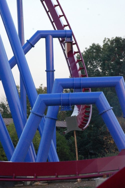 Here's some more pictures from last night. No new track work, but lots of supports are going up for the loop and the immelman. We rode Diamondback twice (full queue is 1 hour 10 minutes with a crew that was constantly stacking) For the record, the main queue house full only takes 25 minutes to go through. We rode Top Gun, Racer, Adventure Express, Windseeker. We also did Backwoods Bayou, Cornstalkers (worst maze/actors), Board to Death (What's up with the lighting in the first half? It was so dark you couldn't see jack sh!t.), Slaughterhouse, and Wolfpack. Here we go again! No Chainz? Looking very good It's going to be steep. From the Coney Mall midway Yeah, it was very crowded Love everything here. Drop Zone twisting and going up, people walking through. -