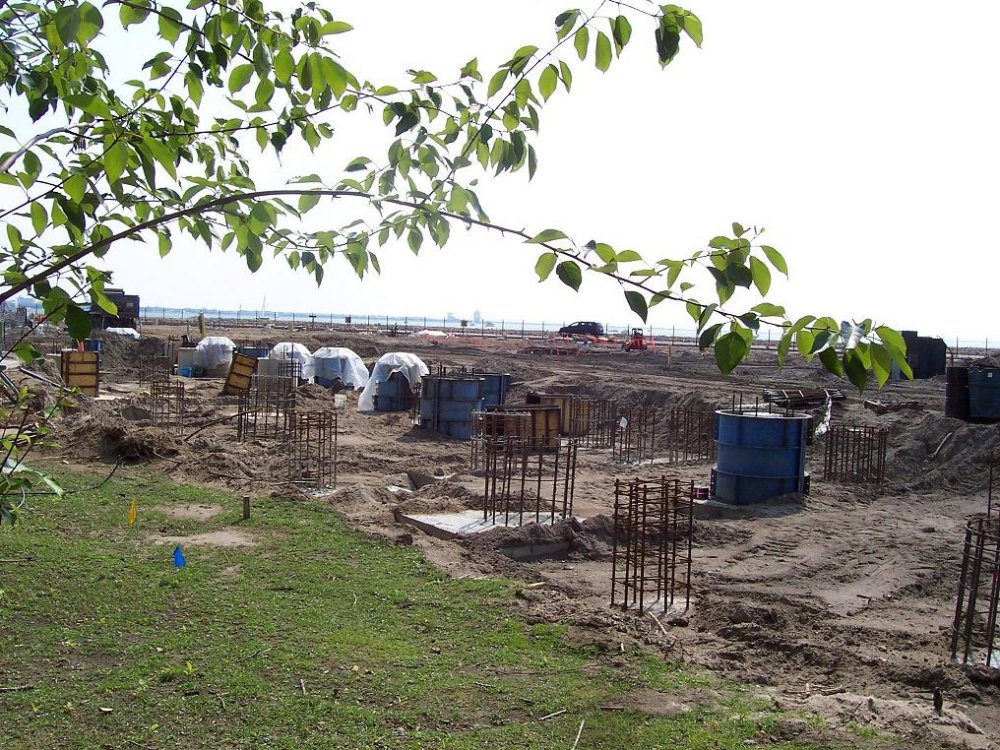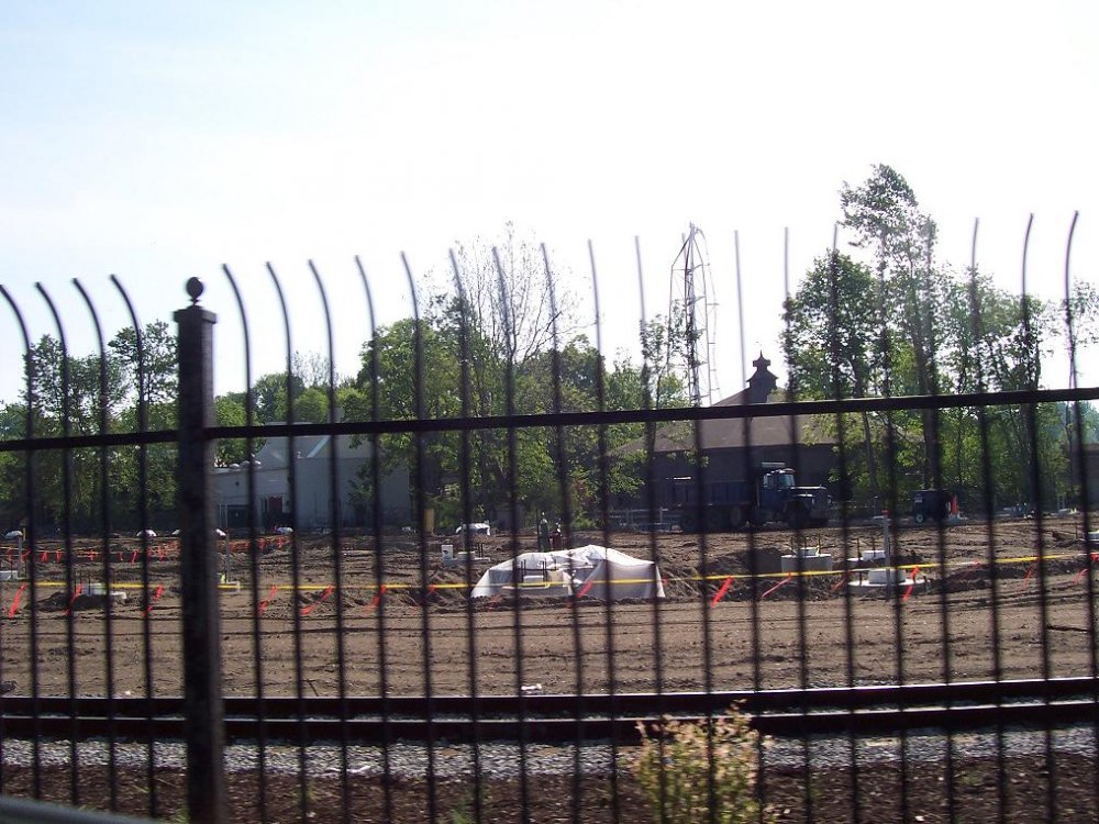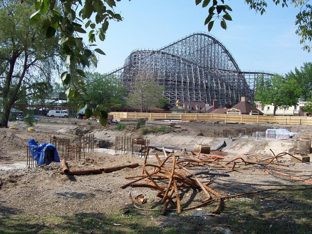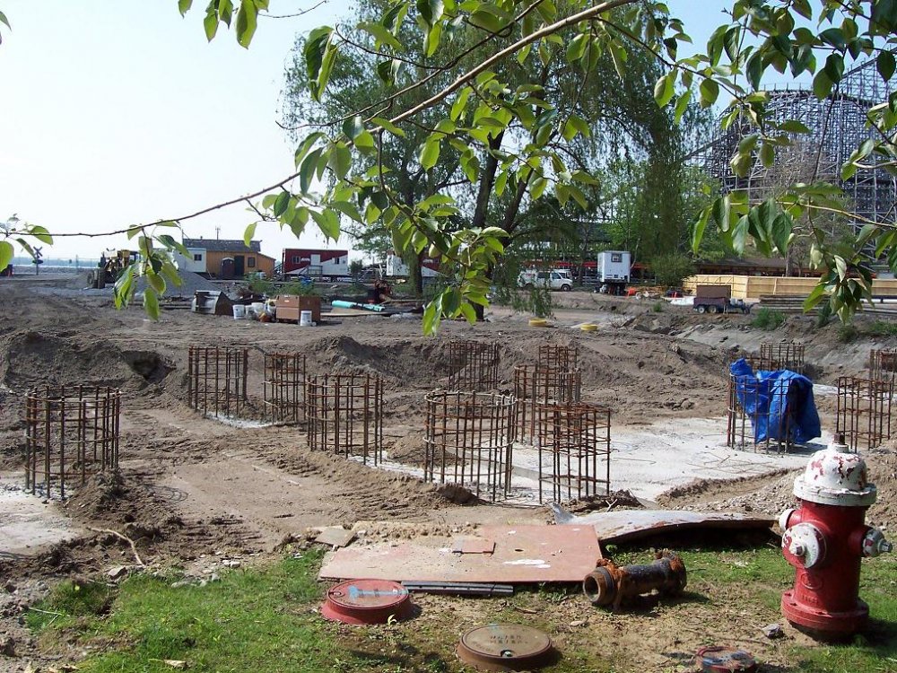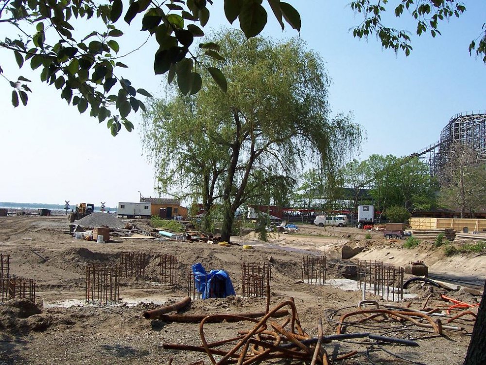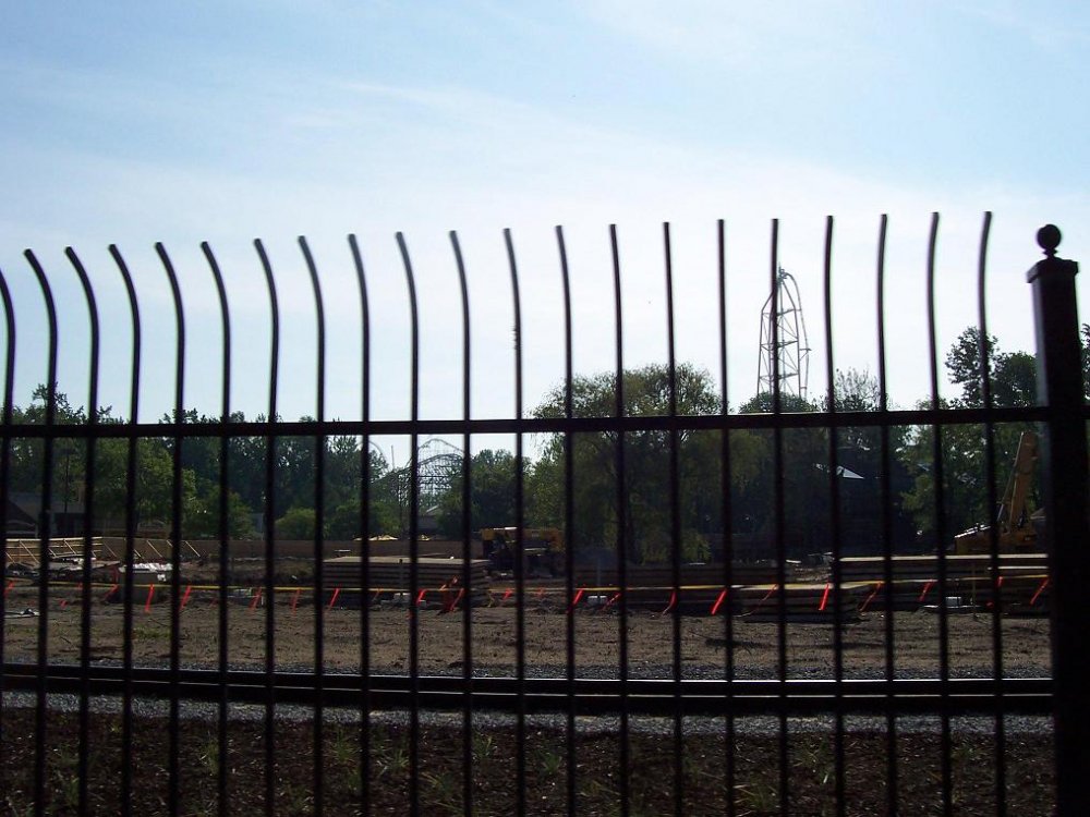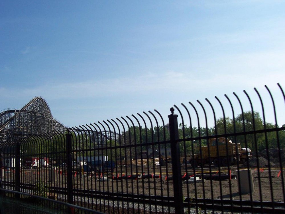 I was at Cedar Point this past Sunday and took a few shots of the construction area as well as a few low-quality pictures of the new track. The track is located outside of the Breaker's Express hotel and the only way to get the pictures was to snap them while riding past in the car. The construction site extends to Mean Streak and involves a large corner area, almost too small for a lift hill. If I had to guess, I would say maybe some sort of a launched coaster without a top hat. As far as the 500 ft. rumor, there is obviously no digging deep enough to support anything going up 500 ft. These pictures should help to get an idea of where the ride will be and shows the obvious Intamin track.