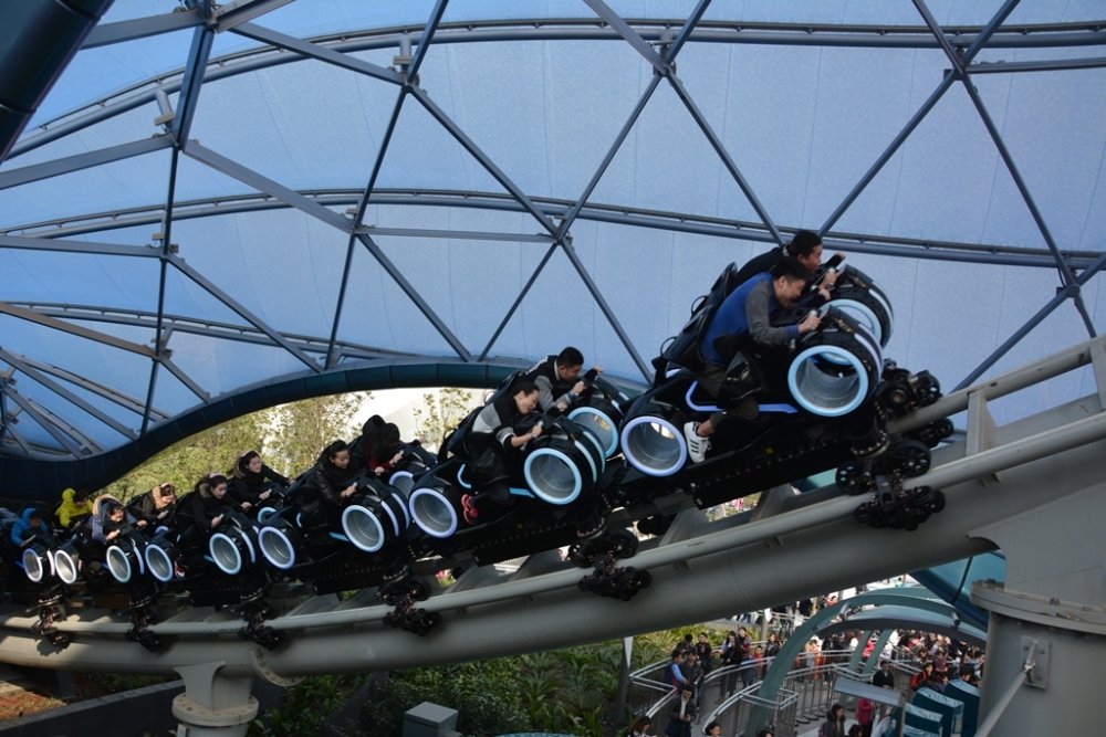 From 2016 Shanghai Disney Pirates It's a challenge to get decent pictures inside but here are a couple somewhat decent images.. just to give you a glimpse. Look up the video for a better idea of this awesome ride. It's almost worth flying to Shanghai just for this ride (I think) sets and video working together overwhelming screen sensations and Jack is there just for the fun a random Tron daytime image -