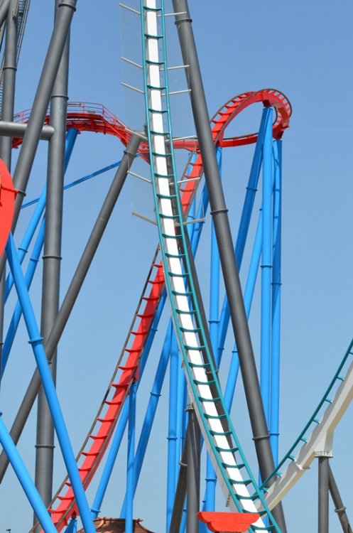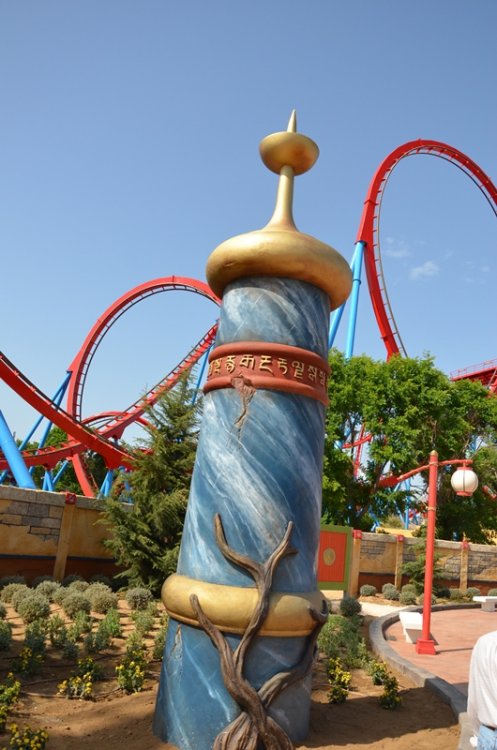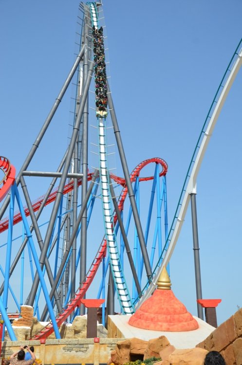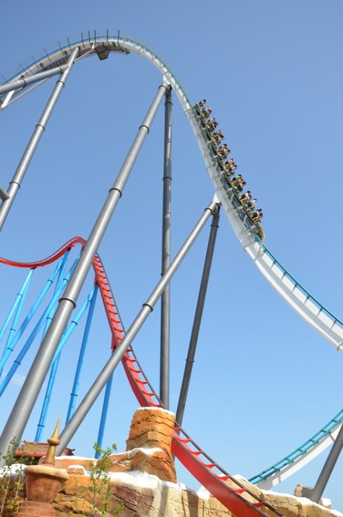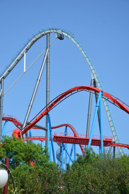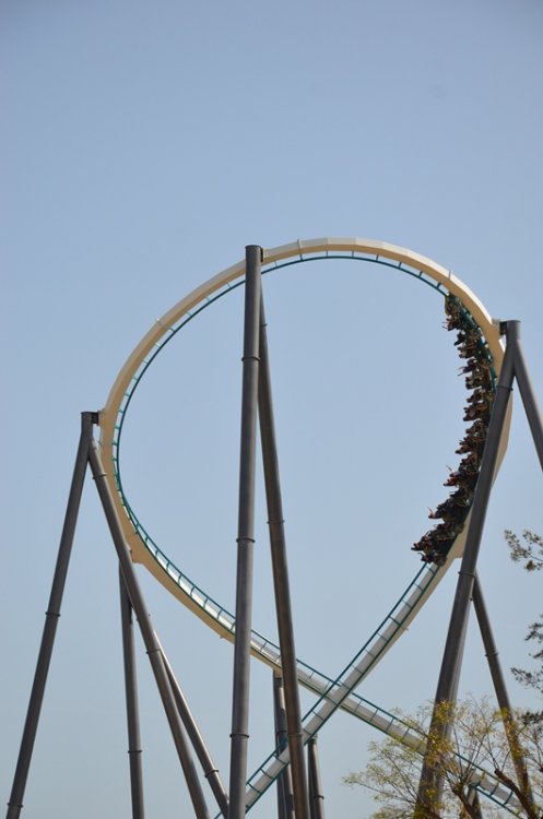 part2 and up we go (again) more theming splash as seen from the other side looking up this is where you can get your onride picture (and video) another look at the station the exit is below motor time and yes.. it'sway bigger then Khan so this is what a 2 hour wait looks like? view from some extra que area looking at the station from this extra que area blue grey red white.. that's a lot of colors almost looks like a maze with all these supports and the ride has not even started yet.. you still have to go up wheee i believe i can fly and skloosh but Khan still deserves some love as well another look at all the folks waiting to ride overview that's a "close" call getting ready for more air and away they go another bit of theming i see hairtime yup,they are smiling, so i guess they are enjoying the ride yikes, happy it's a close call and not a full wardrobe mishap hmm, airtime the Dragon is still there i don't mind this view Khan is doing it's thing the entrance arch when walking from the other side Helix fun it does look pretty more random things close but no sigar they look so tiny another random bit of theming take the tunnel better look at that globe thingy one more look at the station building theming at the end of the exit that's the end of the ride transfer track it's a different view no collission one final look at that figure 8 and that's it -
