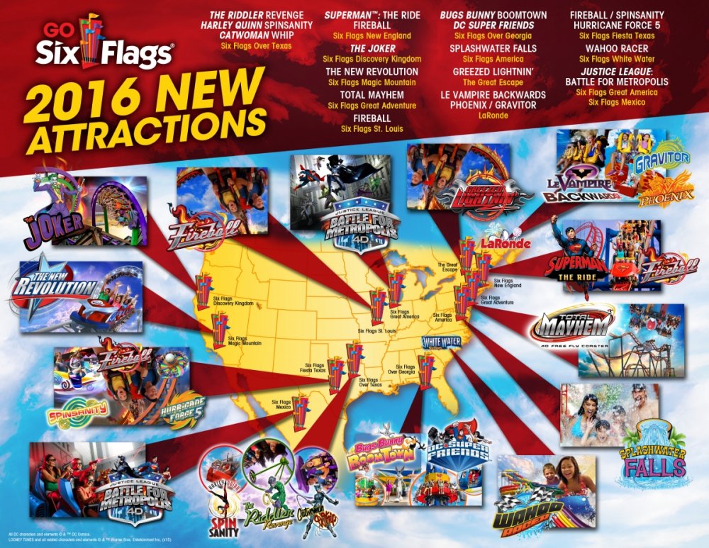 World’s First DC Super Friends Kids’ Area to Headline Major Park Renovation for 2016 Season 12 Rides and Attractions within Two New Themed Areas at Six Flags Over Georgia AUSTELL, Ga. — September 3, 2015 — Thrilling family fun is in the works, as Six Flags Over Georgia today announced the all-new DC SUPER FRIENDS themed area and the all-new Bugs Bunny Boomtown for the 2016 season. The two new areas will feature 12 rides and attractions, in what will become the perfect family destination spot within the Thrill Capital of the South. “These two new sections of the park will offer families hours and hours of fun with attractions mom, dad and the kids can experience together,” said Park President Dale Kaetzel. “This latest expansion continues our multi-year plan to provide thrills for guests of all ages and includes the addition of Hurricane Harbor in 2014, two new devious rides in Gotham City in 2015 and other additions planned for the future.” The original Dolphin Show area, which has remained at the park since the 1990’s, will be transformed into the epicenter for the all-new DC Super Friends kids’ area and will feature 5 new attractions, including: · Superman Tower of Power, which releases the dare devil in the bravest of souls throughout this 65-foot tall bouncing thrill ride; · The Batcopters, an opportunity to help save the City of Gotham by flying high in the sky; · Wonder Woman Flight School, where pilots can take flight and control their own invisible jet; · Harley Quinn Mirror Maze, filled with disproportioned mirrors and devious stares; and · The Joker Funhouse Coaster, the ultimate family thrill ride to show no fear and conquer the Super-Villain through 900 feet of track at 30 miles per hour. The park’s current children’s area, Bugs Bunny World, will be re-themed to Bugs Bunny Boomtown and feature seven attractions, including: · Daffy Ducks Bucket Blasters, a wild and crazy family water battle; · Speedy Gonzales Speed Boats, where guests will be screaming “Andale Andale” on six speed boats; · Bugs Bunny High Sea Adventure, a chance to fly through the air on a junior sea-worthy quest; · Yosemite Sam’s Wacky Wagons, an old western spin on a junior ferris wheel perfect for junior cowpokes; · Looney Tunes Adventure Camp, an interactive playground with Bugs Bunny and all the Looney Tunes characters; · Acme Trucking Company, a monster truck driving voyage to help Wile E. Coyote try to capture the Road Runner; and · Tweety’s Tweehouse, a 20-foot up and down journey into the little chirping bird’s nest. Bugs Bunny Boomtown is scheduled to open for the 2016 season in early spring and the DC Super Friends themed area is scheduled to open Memorial Day weekend. For more information about upcoming 2016 Six Flags rides and attractions, including a video highlighting the new rides, visit http://www.sixflags.com/2016news. Six Flags White Water! It is off to the races to see who is the fastest in the family, as Six Flags White Water adds the new 60-foot tall exhilarating Wahoo Racer water slide. The multi-lane mat racing slide complex is the largest slide of its kind in the world at the South’s Most Thrilling Water Park. Riders will experience the thrill of racing against their friends and family members reaching speeds of up to 40 feet per second on six aero-dynamic designed water toboggans.