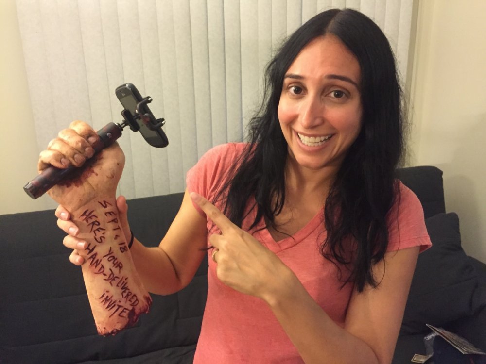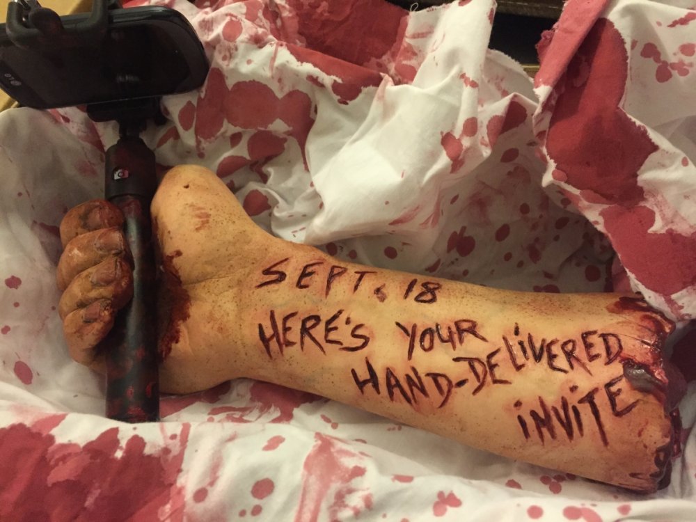 Just got the most amazing invite in from Universal for HHN 25! Check this out... It looks like a nice box... Right? Hmmm... What could be in here? OMG! A severed arm with a selfie stick! Best thing ever!!! "I killed this person myself!" Here's the USB drive with the invite... Jack is back!!! We'll be live tweeting from HHN on September 18th! The phone actually had images on it! Jack sent me a package!