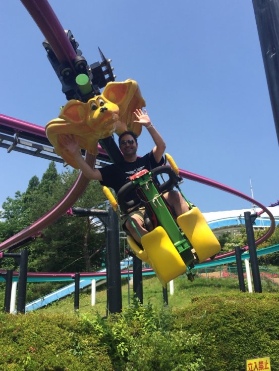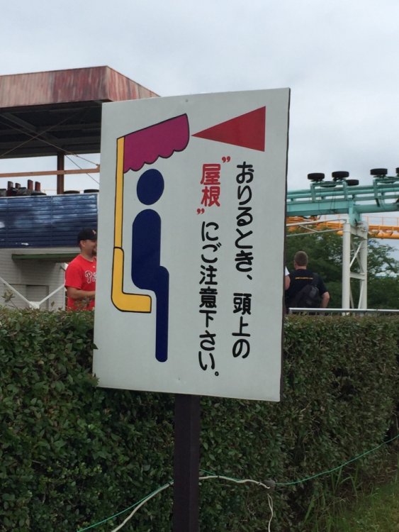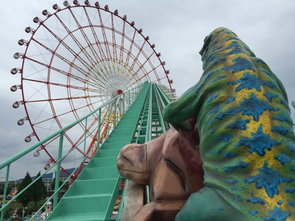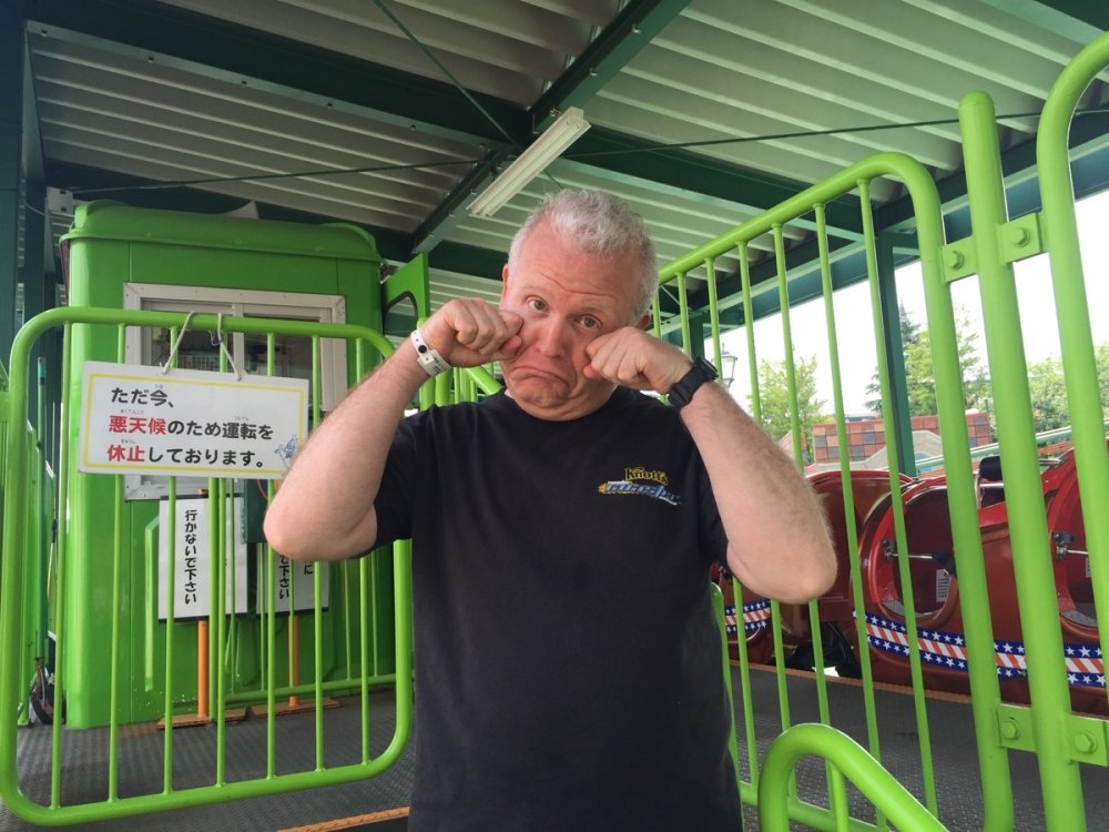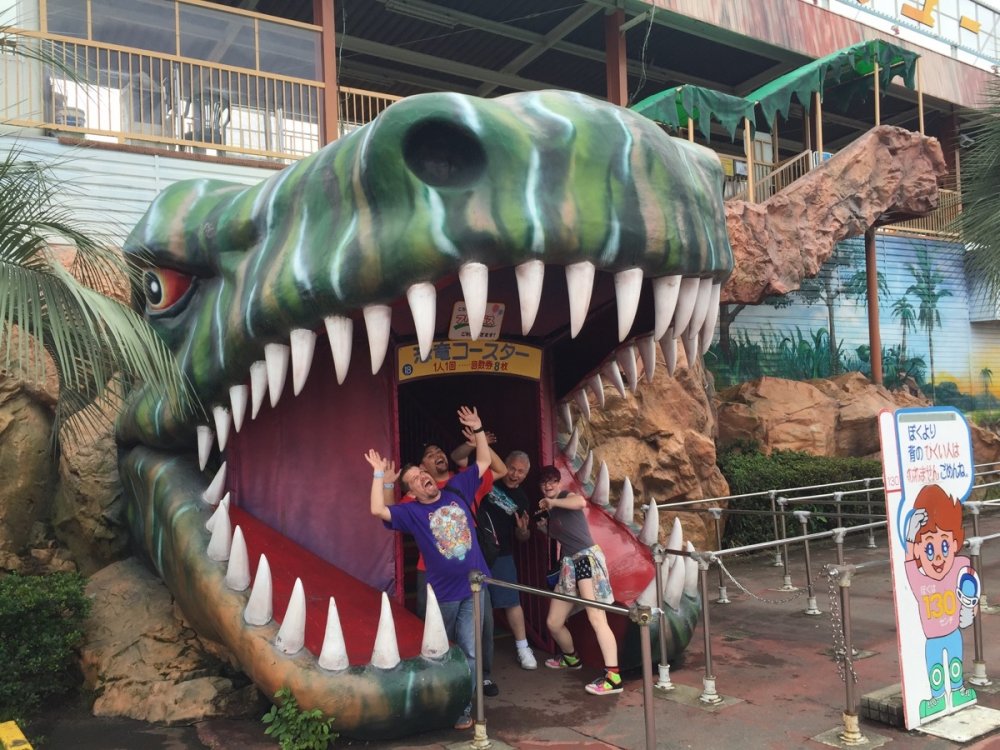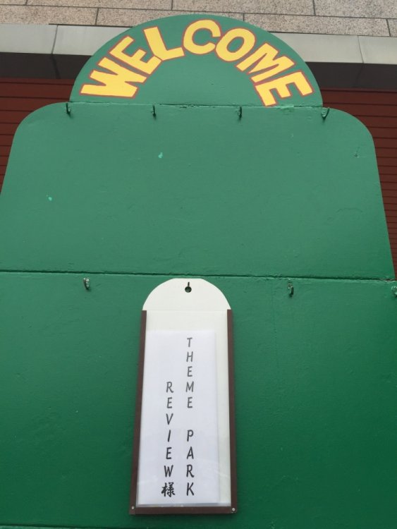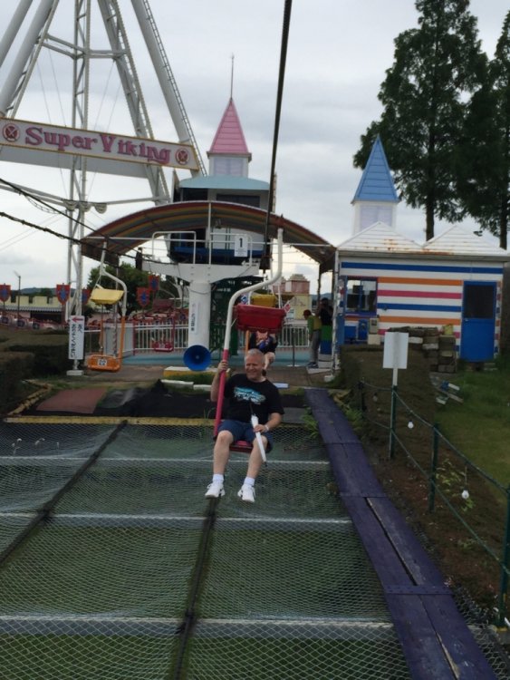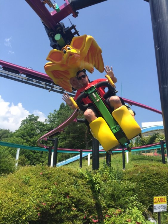 6. We are live tweeting about our adventures in Japan so follow along on Twitter @themeparkreview - Our next stop was Mitsui Greenland! This is a BIG update, so I'm going to let the photos do most of the talking, but I will say that this is one of my favorite "amusement parks" in Japan. Such a great place with SO MANY rides, and a huge variety as well! The park is an interesting setup as most of the rides are owned by different people. While they have a "pay one price" option, your wristband is scanned at each ride and I'm assuming that the operators get a small cut of each time someone rides or takes part in their attraction, as the operators are always trying to come up with unique ways to get people on their rides, and also ride multiple times. Onto some photos! Traveling by train is the BEST way to see Japan! It's amazing how awesome their rail system is! Today, Russell is playing the part of "old man with the cane." I love these signs on the trains! So amazing! From the train station to the park, we travel by taxi Amazing Race style! Arriving at the park, the GIANT Ferris Wheel dwarfs everything else at the park! Yay! TPR welcome sign! Time to hang out and have some fun! I love the look of this park! They have such a random collection of coasters and flat rides here. Of course, Joe goes for the powered kiddie first! Sadly, the Vekoma suspended coaster was closed today, but that's ok, there is plenty of other rides to keep us busy! The dual-track sit down/stand up Togo is actually a lot of fun! And they have a ban on selfie sticks at this park, which we fully endorse! Here's the stand-up train! Here's the sit-down. Oddly enough, this ride is actually REALLY GOOD! Unlike the Togo installations in the US, most of the ones in Japan are fairly smooth and very rideable! I love how Mitsui includes some games like archery into their pay-one-price ticket! Yes, they hand you a bow and arrow! And you shoot! Not many of us are good at it, but when a park hands you a bow and arrow...for free...you don't complain! Yay for Sphinxy: The Ride! In honor of Jurassic World, we are going to get eaten by Gao the dinosaur! Gao is one of those funky Japanese "jet coasters" that's actually pretty damn big, very long, but sort of doesn't do much. They are all fun, but feel like a "huge mine train." And of course on Gao, you get eaten by the dinosaur! The theming is great on this ride! And some of the track sections sure are... "funky!" Gotta love the front of the train with the dinosaur driving it. And yes, the headlights actually work at night! Next up...spinning! Jack and family managed to spin a LOT! Russell hanging out with some of his favorite old buddies. At the top of the hill was a really whacked out haunted walk through and the alpine slide. After walking up what seemed like the amount of stairs that would take you to space, you see cute and funny scenes like this. And some seriously creepy stuff that will haunt your nightmares for quite some time. The girls decided not to be traumatized by the 74 thousand stairs and creepy images, so they did the kiddie swings instead. Goal this year...don't send anyone to the hospital! Already we are doing MUCH better than TPDave and Scottish Steve did on our last visit! "Hey look! All my skin is still in tact!" This is what Scottish Steve and TPDave DIDN'T do on our last visit! No one fell off the sled... ...No one left pieces of human flesh on the track! Success!! "No pictures, no pictures! Please contact my agent!" All that's left of the old shuttle loop is one loop....still kind of want to ride it! lol BEST part of this park? Japanese McDonalds! Best part of Japanese McDonalds? Shaka Shaka Chicken! Yes! It's still here! This is seriously a highlight! Not sure why this never made it to the USA, but a bastardized version did make it to Europe. There's the chicken in the bag. You pour in the awesome sauce and you shake the crap out of it! And Ta-Da! You have one of the most glorious, blazing hot fast food items ever created! Yum! I don't know what exactly is going on here... Time for some more random dark rides and things... This one is a shooter with lots of funky Japanesey stuff. This one is a haunted house ride where you wear headphones... The audio portion is actually really well done! And you see screwed up stuff like this... ...and this! Next up was the candle walk-through where you hold a candle and try to keep it as still as possible while things are jumping out at you. The more still you keep your candle, the more points you get! Indoor coaster with random space theming! Yay! Tons of flat at this park. This Starflyer was AWESOME! Got video of it...will post soon! They also had one of these awesome Togo Paratrooper/Enterprise rides. They lock the seats in place while they swing and you get a really bizarre ride out of it! Yes! Chair lift of death! One tiny seat - no restraints! This translates into "Sit your ass down...don't fall. Thank you!" And yet another park where they just hand you an animal to hang out with! While this guinea pig was not presented in a basket, it was still cool! They have dogs in their petting zoo! Yes! Most Japanese don't have bigger pets because of smaller living areas. So they are in the petting zoo! Still one of my favorite coaster views - Sitting behind a dinosaurs butt while ascending towards and GIANT Ferris Wheel! Really do love the theming of this ride! Weird how the dinosaur is going to get eaten by the dinosaur! Such cannibalistic creatures! A little more of the layout of Gao. Jack doesn't like Ferris Wheels...at ALL...so we are taking him on as many as we can this trip, because we are really nice like that. The view of the park is fantastic! Obviously, as you can see, Jack agrees! lol Another view of Gao.... And yes, they have an Ultra Twister here...and we will get to that in a moment... This Ferris Wheel is about 350 feet all...and it's AWESOME! Here's the Mitsui hotel...looks kind of cool. Jack did it! 350 feet up, a