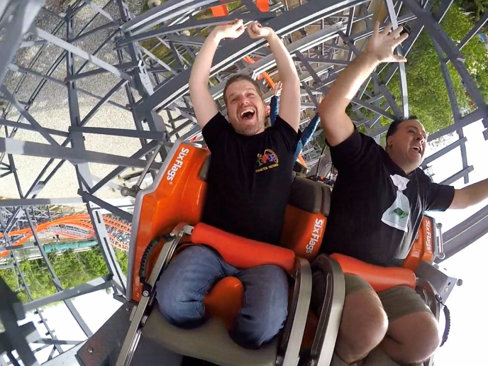 There are so many things I want to say from today's media event, but I'm crazy busy right now with editing footage and photos from like 6 different media events so I'll keep this short for the moment. The ride is ABSOLUTELY FLIPPING MENTAL! It is right up there with the likes of Medusa, Outlaw Run, and Texas Giant. OMG! You hit the brakes and you seriously have NO IDEA WHAT THE HELL JUST HAPPENED!!!! I only got to ride twice today due to having to "work" to get footage and everything, but OMFG the ride delivers, and delivers, and keeps on going. Here's a couple of pics and the POV from today. I'll have a lot more soon including some rider cam and they let me shoot a back-seat POV! We are here at Six Flags New England for Wicked Cyclone's media day! Excited!!! Just took our first ride! OMG! Words cannot describe how awesome it is! WOW!!! The ride is unbelievable! The airtime. The inversions. The speed. WOW! Easily a "top five" ride! Opening ceremony to begin soon! Some pics of the first official train: Awesome panoramic of #WickedCyclone First drop YANKS you out of your seat! Every one of the inversions just feels like it's being taken at insane speeds. Got this cool aerial view from Sky Screamer! (FYI - It was from Pivothead glasses which were securely attached to my head and approved by SF management that morning.) And you can tell from this pic how much we LOVED it! More pics and video coming soon!