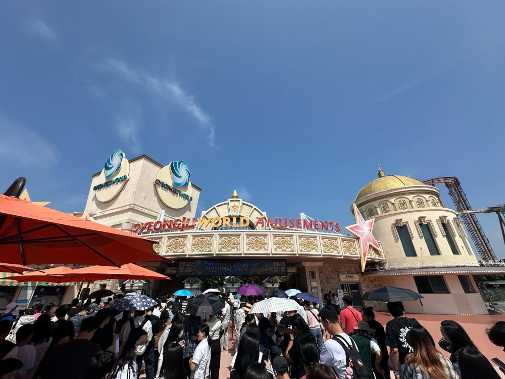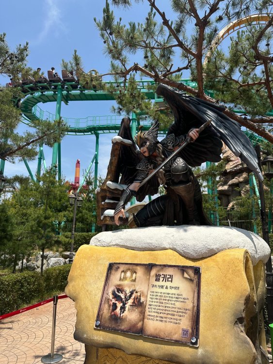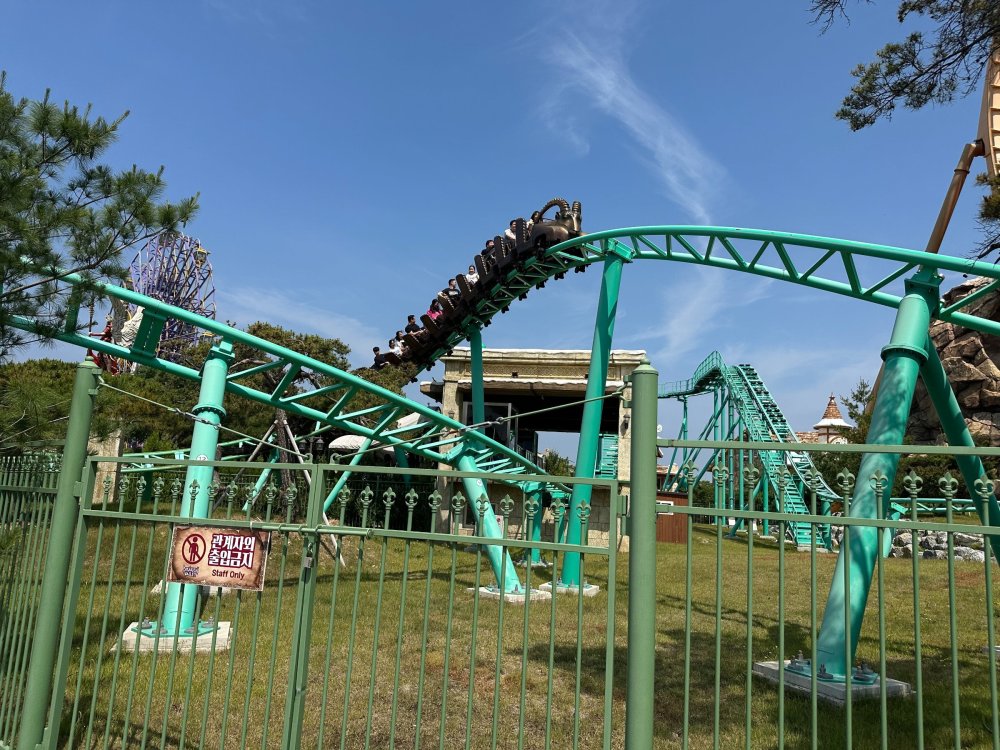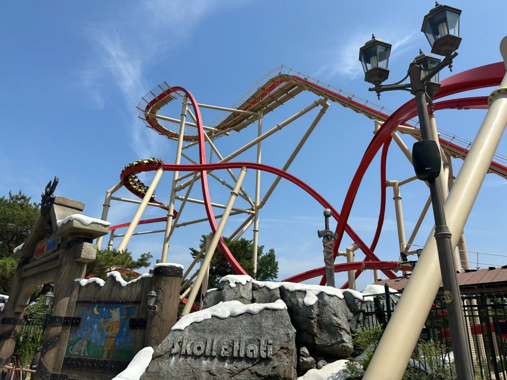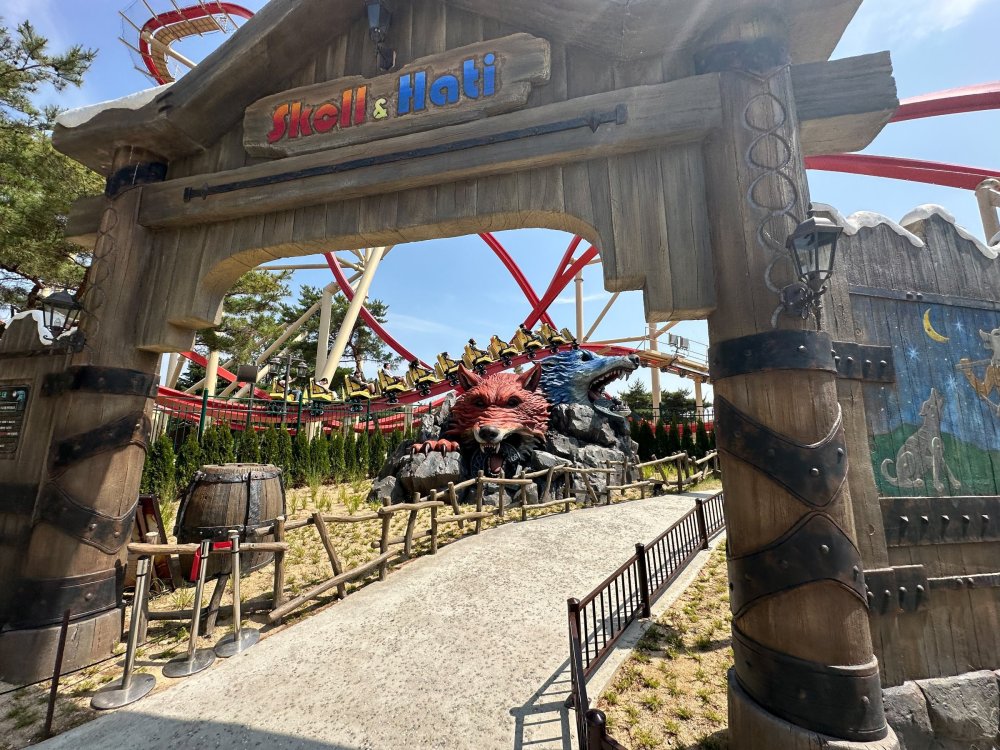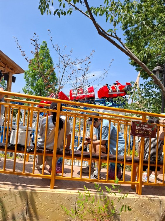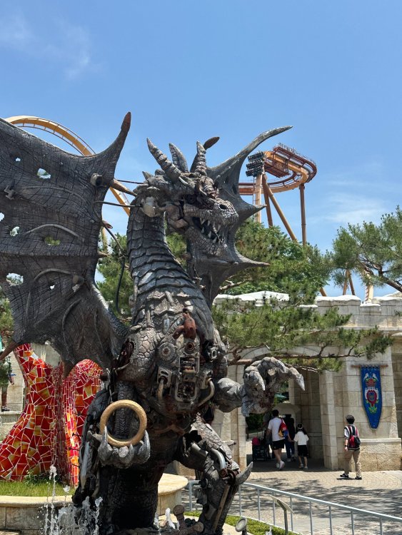 Visited Gyeongju World on Saturday. We had been in the city to visit the historical sites and stay at a pool villa. We went to Gyeongju World in the middle of a three-day weekend, and although the crowd didn't look too bad, lines were very long so mostly just took pictures. Opening crowds didn't look too bad but by the time we were in the park. Draken, Valkyrie, and the new RMC Raptor lines were already spilling out of their areas. Most of the new rides are all located in the same area so all the crowds surged to the right so we went to the left and grabbed a few smaller or older rides. The place still looks as well kept asmy visit when Draken first opened. Time Rider, the new Intamin hotness sadly didn't open in May, but it's opening will be late June. Early bird tickets will be on sale soon but when the Raptor had that sale they sold out in 30 seconds. It was already 33C when we visited so I'll wait for the new hotness and literal hotness to disappear before I head out to try it. Heading into Draken Valley to check out where all the new rides are. Valkyrie is a new family shuttle coaster. It starts with a backwards climb, two forward loops and then a backwards loop. With one train only and 3 laps the line was 80 minutes but the children wanted to ride it. I think even on quieter days line can still be long due to capacity but thankfully like many new rides.... ... Gyeongju World have benches installed in all their new ride lines. A great addition I wish more parks had. This was Wizard's Race to replace the old double helix power coaster. I don't know how Zamperla did it but somehow they made this new replacement rough in 6 months and a slam into the brakes that made me think it was the same as the 30 year old one it replaced. The park like all Korean parks sells fold out stools for people. Some people made sure to get their money's worth even when benches were available. Draken line was spilling out but out of all 5 coasters is the only one that can really people eat and keep the crowds moving. I didn't ride this time, I've done plenty in the past and was with a family group. Was tempted to ride Klake but line was also a minimum wait of 90 minutes. Some photos of the new RMC Raptor, Skoll & Hati. Really torn on missing this credit and my first ever RMC but the line never dropped below at least 120 minutes and it didn't feel fair to leave all the family behind. I also figured I'll be back late fall/early winter or sometime soon since I really want to try out a Coaster Wheel and the coaster will hopefully be around for a long time to get that ride in. -
