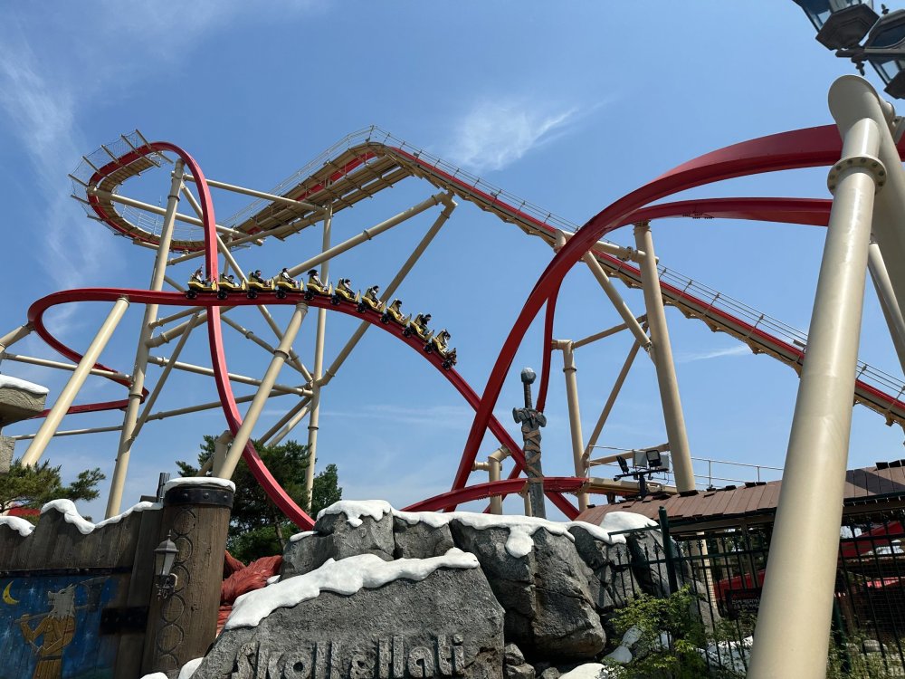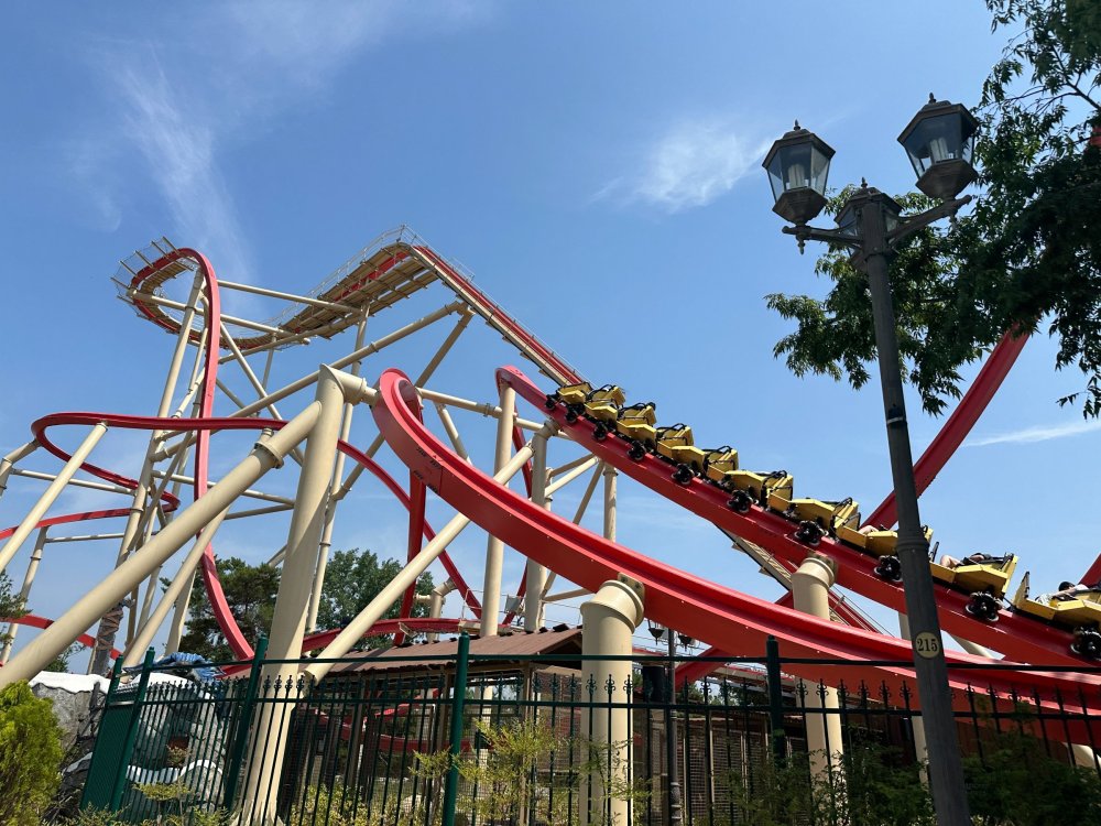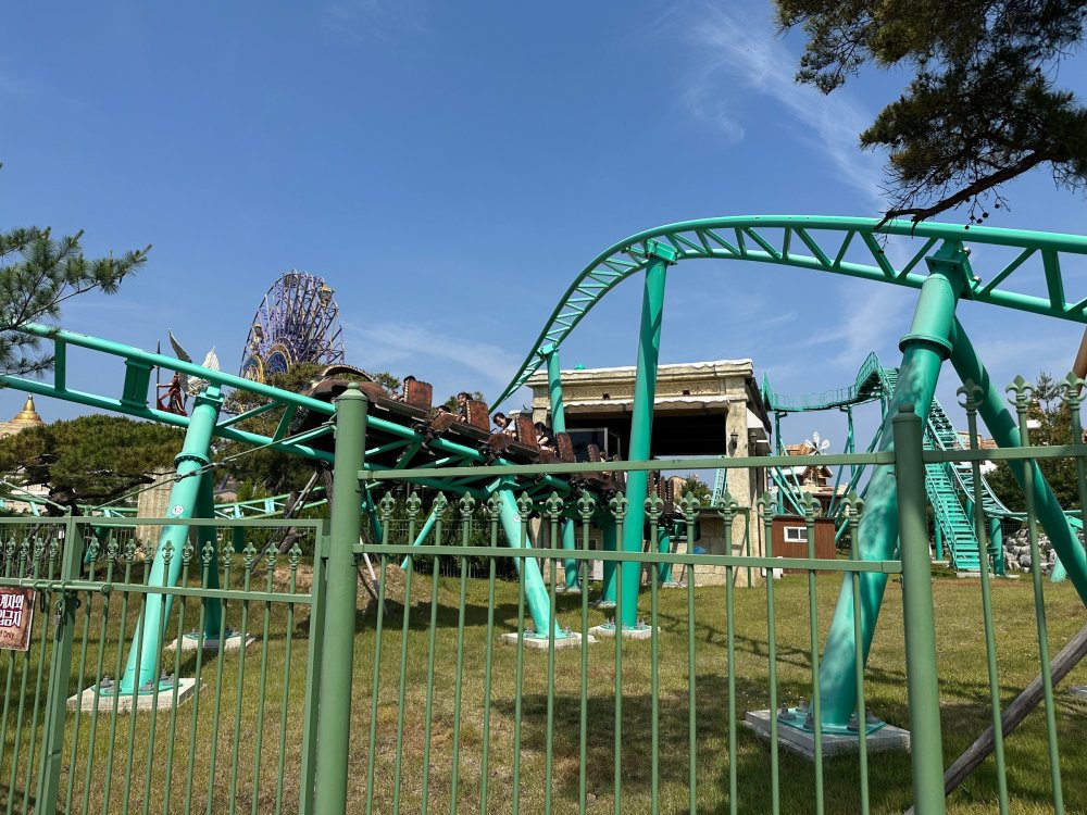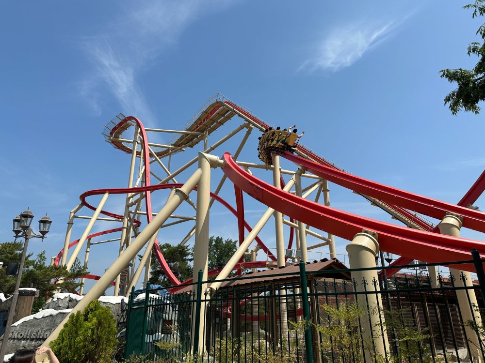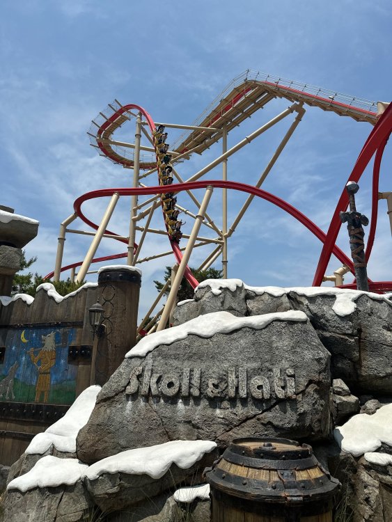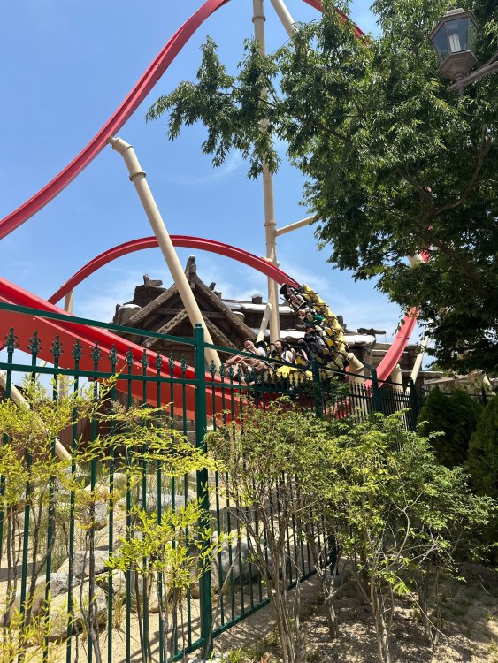 Visited Gyeongju World on Saturday. We had been in the city to visit the historical sites and stay at a pool villa. We went to Gyeongju World in the middle of a three-day weekend, and although the crowd didn't look too bad, lines were very long so mostly just took pictures. Opening crowds didn't look too bad but by the time we were in the park. Draken, Valkyrie, and the new RMC Raptor lines were already spilling out of their areas. Most of the new rides are all located in the same area so all the crowds surged to the right so we went to the left and grabbed a few smaller or older rides. The place still looks as well kept asmy visit when Draken first opened. Time Rider, the new Intamin hotness sadly didn't open in May, but it's opening will be late June. Early bird tickets will be on sale soon but when the Raptor had that sale they sold out in 30 seconds. It was already 33C when we visited so I'll wait for the new hotness and literal hotness to disappear before I head out to try it. Heading into Draken Valley to check out where all the new rides are. Valkyrie is a new family shuttle coaster. It starts with a backwards climb, two forward loops and then a backwards loop. With one train only and 3 laps the line was 80 minutes but the children wanted to ride it. I think even on quieter days line can still be long due to capacity but thankfully like many new rides.... ... Gyeongju World have benches installed in all their new ride lines. A great addition I wish more parks had. This was Wizard's Race to replace the old double helix power coaster. I don't know how Zamperla did it but somehow they made this new replacement rough in 6 months and a slam into the brakes that made me think it was the same as the 30 year old one it replaced. The park like all Korean parks sells fold out stools for people. Some people made sure to get their money's worth even when benches were available. Draken line was spilling out but out of all 5 coasters is the only one that can really people eat and keep the crowds moving. I didn't ride this time, I've done plenty in the past and was with a family group. Was tempted to ride Klake but line was also a minimum wait of 90 minutes. Some photos of the new RMC Raptor, Skoll & Hati. Really torn on missing this credit and my first ever RMC but the line never dropped below at least 120 minutes and it didn't feel fair to leave all the family behind. I also figured I'll be back late fall/early winter or sometime soon since I really want to try out a Coaster Wheel and the coaster will hopefully be around for a long time to get that ride in. -