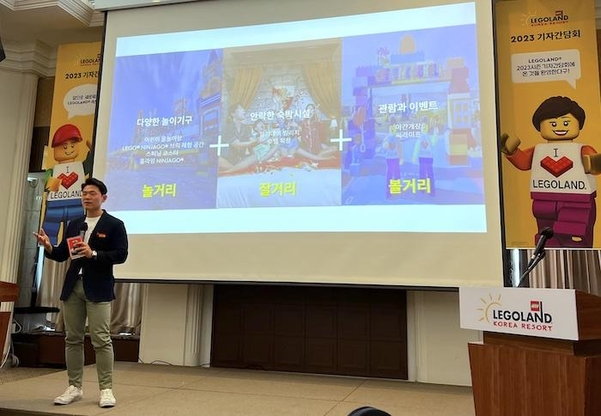 Source Tried googling some keywords in Korean such as 'Legoland future' or 'Legoland investment' and this came up. It is an older article but behind the CEO in Korean the bottom two lines in Korean say 'Spinning Coaster' and 'Flying Ninjago' so with the poster on the construction wall it seems an early indicator a spinner of some kind is coming to the park. Considering the audience of the park I assume a family spinner of some kind over something more extreme.