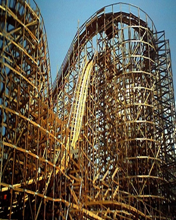 Nice train pics. I wasn't impressed with the old school 70's linoleum look for detailing. What I liked about the Texas Cyclone was that you could strikingly notice the red or blue trains against the white painted structure. The trains color is practically the same color and design of the wood used for the structure. Vote now for your preferred choice(s) of color for if you could do so. ___ YELLOW ___ WHITE _X_ BURNT ORANGE ___ RED ___ BLACK ___ GOLD ___ BROWN ___ GREY ___ SILVER ___ GREEN ___ LEAVE AS IS