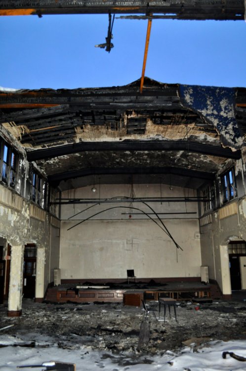 12. Welcome to Camp 30 Recently, a housing development group purchased the land and historic buildings known as "Camp 30" in Bowmanville Ontario, with plans to tear them down and build a subdivision. My friends and I decided that we should make a trek down to the area and take some pictures and explore a bit before the opportunity is gone for good. Some interesting history about the Camp: The camp was originally built in 1925 as a training school for delinquent boys. The school was named, “Pine Ridge Boys Training School”. Later, this school would be named in a multi-claimant lawsuit for physical, emotional, and sexual abuse against its residents. The school was transformed into a Prisoner of War Camp during WWII used to hold High Ranking German Officials. The location was picked as it would prevent, in the case of escape,the highest ranking officials from returning to the war across seas. Conditions for the prisoners were excellent, 5-Star rated, and the only complaint about the camp was that the urinals were too low. There was only one attempted escape, in which failed. The Nazi prisoners created an underground railroad pulley system underneath building 4. It was used to carry dirt from the construction of an underground tunnel back to the building to be stored in the attic. Fortunately, before the tunnel was completed, the weight of the dirt stored in the attic caused the celling to collapse, and the prisoners plan was foiled. The camp returned to its original use as a Private School and more recently was used as the campus of Darul Uloom Islamic University, where it was abandoned in spring of 2008. When abandoned, all the contents were left behind, and the buildings have since been severely burned making for a very lonely, eerie environment. Since our visit, the Developer has donated 24 hectares in which the 18 buildings sit and the area surrounding them to the community to be turned into a historical park. Refurbishment and Reconstruction is being done to the buildings to return them to their former glory. The historical value of the buildings is incredible and the buildings are beautiful, especially the Gymnasium and Pool House. I used a Nikon D5000 to shoot, and it was my first time using a DSLR, so forgive me if the photos aren't the greatest! The long walk to the grounds Choose thy fate... Welcome to Camp 30 The Administration Building Main Hallway Of The Administration Building Main Office Destruction... Thank-you Regan... Destruction Lone Tree Girls Dorm Basement of Girls Dorm Nice Architecture in Girls Dorm Some Writing On the Wall in the Girls Dorm The Cafeteria Main entrance Let the light in The cooking days are over Empty storage Deep Fryer Exhaust Down to the basement? Big Red Door Mechanical Assembly Hidden Tunnels Galore Electrical Building 1 Down the hatch Transport conveyors under the buildings Lovely More Tunnels Underground hostage Bloody hand prints in the basement... Pool-house and Gymnasium Pump house Pool Love the colours in here... need to go during the day The Gymnasium Basketball Nets The Outskirts Water Return Pipes Main Schoolhouse No more performances here... Crumbling Flaking Paint In need of some Custodial Cleanup Clean Florescent Destruction Florescence...