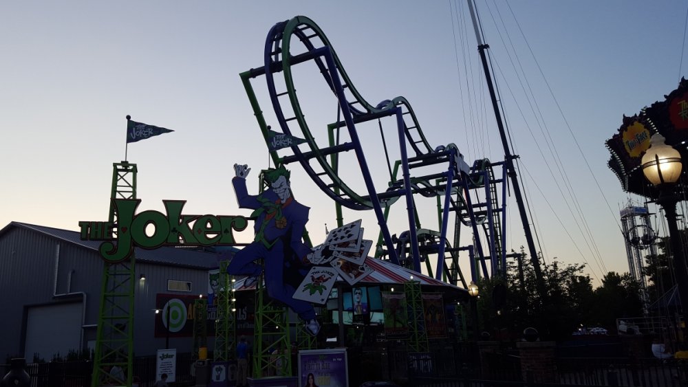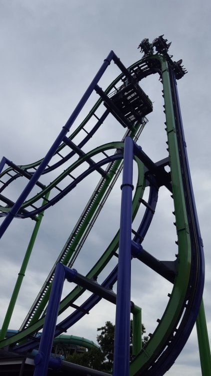 Very quick TR from tonight. Some notes and then pics: -My girlfriend, step.son and I got to the park at 7:30pm. Obviously it was a hot and VERY humid day, which left the park relatively empty upon arrival. After we rode Justice League, which had only a 10-15min wait, we walked over to El Toro. My step son, who is about 52 inches tall, lost his Toro virginity last year so I was very excited to get him back on. Unfortunately, the ride was closed to an incoming storm. Less than 5min later one of the nastiest looking black clouds fell over the park, closing everything that wasn't indoors. We high-tailed it to Skull Mountain, which was a walkon. After getting off it started pouring, so we opted for another JL ride. JL had a 10min breakdown, which made it a 20min wait. After getting off the ride it was 9:15pm, and I heard a roar in the distance. Nitro and Batman had just reopened! Got a walk-on last row lap on Nitro before running over to Toro, which was closed for the night. Noticing Joker was open on the run over to Toro, we got in line with just 5min left until park closing. -HUGE props to GAdv for reopening these coasters with only 40min left until closing. The forecast had 60% precipitation and a severe thunderstorm warning until 10pm but they still got these coasters running with the park COMPLETELY dead at that point. Nitro was even still running 3 trains despite being down for nearly 2 hours and having a max of 10 people in the station. -Speaking of Nitro, it was running amazing tonight. Each hill gave sustauned floater that kept my butt out of the seat for 4-5 seconds at a time. I guess the hot weather and slick track made the difference but it was one of the best rides I've ever had on it. Nitro at night time is also always a great experience. -I really like the blue paintjob on the Studio 28 arcade and the Gotham City retheme of the souvenier shop. Didn't pay attention to either on my last visit but they are solid little upgrades. -Got the top score for my vehicle on my 1st JL ride! Once again a really fun ride. Unfortunately people have started vandalizing the queue, ripping off paint and other elements. -Joker looks great at night! It was my first time seeing it with the neon floodlights and it looks really cool at the end of Main Street on the lake. The ride itself wasn't as intense as SFNE's a couple weeks ago but there was one moments where we were upside down a good 3-4 seconds. Even though it is short and a clone I do feel.it adds to our lineup. Overall, for 2.5 hours and a thunderstorm we ended up having a really good time! Once again a big thank you to the park's tremendous weather policies! Some pics... New arcade paintjob. Nitro at sunset. Also didn't notice the theater facelift. Looks really good! High score! No idea how people are getting 400k+ scores on this thing but getting first place gave my ego enough of a boost lol. Batman...through the trees. Golden Kingdom. This was when the storm was approaching. Love this pic. Joker lit up with the storm cloud over it. Random Buccaneer shot. Girlfriend and step son at the fountain. If only GL rode as nicely as it looks....