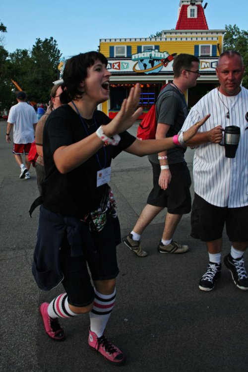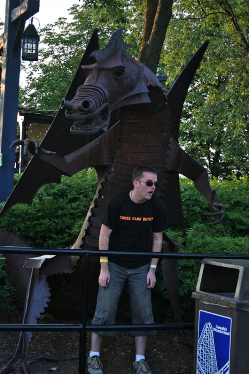 Day 2b: Martin's Fantasy Island Before I do the TR for this park, let me tell you a little [95% off-topic] side story that all of you are welcome to completely ignore and skip over. As I was driving up to Pennsylvania the Friday before the trip, I was eating a chicken wrap, when suddenly the left side of my jaw started aching horribly and I couldn't open my mouth much wider than an inch. FUN TIMES, let me tell ya. But, dang, I had spent all that money, just survived four hours of 10mph traffic, and shaved my legs special that morning - ALL FOR THIS TRIP - so I was NOT going to let a little jaw pain and the inability to use my mouth to ingest large foodstuffs get in my way. MY JAW IS NOT THE BOSS OF ME. But when the pain didn't go away, I made myself a dentist appointment half way through the trip for when I got back home, and the scary, scary dentist-man used words like "inflamed," "tmj," "unrepairable damage," "hopefully no surgery 'til you're sixty," and "we'll cross our fingers, mmk?" So, for those of you who were on the trip, if it seemed like I was unable to fit a cheeseburger in my mouth, if you noticed that I couldn't eat a spoonful of cereal without my lips pushing most of it off the side of the spoon, and if it seemed like I was gumming my food more so than actually chewing it, well, you saw correctly, but it's not because I'm some moron that doesn't know how to eat food, or something. It's because my jaw, it pains me. And that's basically my story. There wasn't really a point, other than to show you what a trooper I am, surviving all the jaw pain during the eating and roller coastering and whatnot. But you know what? I pushed through that pain, I suffered for my hobby, and I rode those coasters with a fiery passion; and given the fact that my jaw is still hurting this very second, I think that gives me the right to call myself the Kerri Strug of theme parks, thank you very much. [/story] SO! TRIP REPORT! Martin's Fantasy Island is a cute family park, worth visiting if only to ride Silver Comet. And maybe to canoe in a sickeningly viridian lake. Or pond. However you would classify it. But really, Silver Comet is a fantastic woody, and I know it ended up on many top 10 lists that night. I didn't explore the park enough to really give it an accurate report beyond "Silver Comet! It's good!" though, because apparently there was a whole section with giant statues that I completely missed. And I don't mean the statues were abnormally large, I mean that there were actually statues of giants. Though, I guess they were abnormally large, too, hence the term "giant." BUT! What I'm trying to say is that if one attends a park but comes away completely ignorant of the giant giant statues, obviously one did not do said park justice. Having said that, on to the photos: A view from the Ferris Wheel of Niagara Falls, and lo! Marineland! See it?! Let that serve as the foreshadowing of things to come. But up next, at some point this week, Canada's Wonderland. Stay tuned. Nighttime! Erik giving the lion head. Haha...get it? *giggle* Head... Well...almost every square inch. I could say something else relating back to the photo of him and Neil in the log, but goodness, even I have my limits. Even Jahan was soaked on every square inch of his body. This flume made everyone giggle. But see? Neil enjoys taking it like a man! Tyler: "Uh, Jahan? Neil? What's going on up there, buddies?" I'm glad I wasn't one of the five, though. From what I understand, they don't normally cram in five full-grown adults, but for us, they made an exception. Simple layout, yes, but it's the modest flumes you have to watch out for. Sorry, I don't know how to make a Ferris Wheel funny. Ferris Wheel! Brooke likes to move when the music so compels her, but I think the guy on the right *dearly* wishes that she didn't. Forget the TPR Bag o' Crap, Martin has a whole WALL o' Crap. The option of the game was to take a picture of yourself throwing the ball in the box. Or something like that. I dunno, I wasn't really paying attention. Probably why I didn't win. "I GOT IT!" My hair looks like Medusa's snake-do, but forget that, Jake clearly found this spinning mouse to be orgasmic. Judging by the mouse's expression, however, the feeling wasn't exactly mutual. Full Tilt - hah, yeah right. Ok, so they warned me of all the tilting before I boarded, so while on the ride, I kept waiting and waiting for the omg!tilting to begin. Then the ride was over, and I was all like, "Wait, where was all the tilting?" But everyone ELSE apparently felt it - they were all talking about it and saying how CRAZY all! that! tilting! was! Well, dadgum, how'd I miss it then? Two theories: 1. I think Martin got everyone together to play a joke on me ("haha, let's call this thing "Full Tilt," and in a few years when Natalie visits, let's get everyone to convince her that it really DOES tilt, and she'll be so confused when it doesn't, and man, what a worth-while joke, right?") or 2. my messed-up TMJ-ified jaw has severely numbed my inner ear. Or something like that. I don't really know how biology works. The GP seems pretty relaxed and un-freaked out, though. Go figure. I thought I'd find this calming and relaxing. Instead I found out I'm afraid of heights. Like, white-knuckled-holding-on-for-dear-life-sorry-can't-talk-too-busy-closing-my-eyes afraid. This thing didn't even spin. Tell me, Martin, WHAT IS THE POINT? I see three claps and a thumbs up. I think it's a winner. This is just about the only photo I have of Silver Comet. Man, I failed this park something terrible. : Who you trying to fool, Martin? No body of water is naturally THAT shade of green. -