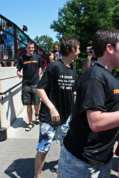 Day 3: Canada's Wonderland Head. Ache. City. Aside from Behemoth and maybe Vortex, it's got a really mediocre collection of coasters. Up until this year, it was as though CW was afraid to have one coaster outshine any of the others, so they decided to make them all rank at the same level of general meh-ness. It's like the socialist of amusement parks. But what they DO have going for them are some decent flats (Shockwave and Sledge Hammer come to mind) and the fact that it's the prettiest of the former Paramount parks in my opinion. Not that it's the Canadian Disney World, I'm just saying it was way better than, say, a Six Flags. As for Behemoth? OH. MY. GOSH. I think it ranks as my new number one coaster, even ahead of Apollo's Chariot, Nitro, and MF. First of all, nighttime ERT was almost a religious experience, as the view from the top of the lift hill is nothing but city lights, all 360 degrees around. It was simply stunning (I'm used to there being nothing but forests, and miles and miles of trees can get kind of boring after 22 years). Second, this is the first coaster I've ever been on that I actually got more air time in the FRONT than in the back. The ride literally threw me forward against my restraint, and I couldn't have held myself down if I tried. After my second ride in the front, I labeled it "The Seat of God," and last I checked, it was a term that was unanimously agreed upon. On to the photos: Goodnight Canada! Next up...Marineland And a Behemoth encore And as tradition thus far, we'll end with some nighttime shots And judging by the jaded look on Luke's face, he's had plenty of practice Don't worry, I hear the first time can be a bit painful... This is the only photo I got of the coaster (and it's a pretty pathetic one at that), but I think these next two photos will make up for it Erik is getting a jump start on his reaction, while Josh is in disbelief that girls are actually looking at him for once. Wild Beast, and THIS was one of the worst coasters of the trip. You know how girls shed the lining of their uterus once a month? Well, I think this one knocked an extra one loose in me. Hah, I just heard all the boys on the forum gag a little. I was terribly disappointed with Ghoaster Coaster. I LOVE the clones (they are clones, right?) at Carowinds and KD, but this one was far rougher and seemed to lag in some spots. This is a terrible shot, what with the building taking up half the frame and all, but it's the best this terrible coaster deserves. In case you forgot what coaster you were just looking at (Yeah, that's right. I just ended a sentence with a preposition. I'm the kind of girl who likes to live on the edge. What're you going to do about it? ) In the words of Neil, "I LOVE YOU DIVING HELIX!" Even God loves Behemoth enough to part the clouds above the lift hill Coaster paparazzi This is what I like to call an "up the skirt" shot No, he wasn't doing an impression, that's just how Dave walks. I mean, he IS British. One rider was so kind enough to pose for us. Prepare for a SLEW of Behemoth photos Behemoth walk back! Minebuster. Bad, but I've been on worse. Oh my gosh, WHY IS THERE ONLY ONE OF THESE IN EXISTENCE? Yes, that's the line for Behemoth way out there in the midway, and all I have to say about that is thank goodness for ERT! Nothing against Arrow suspended coasters, but it's sad to think that this was the best coaster in the park before Behemoth was built just this year. Still, I did love me some Vortex. Good thing this photo was taken earlier in the day, because I became a bit bitter towards it when I was told that these weren't the REAL Niagara Falls. Typical amusement park welcoming pool You couldn't get this wet if you swam in the ocean. During a hurricane. And wet your pants. YOU CAN SEE BEN'S BLUE MOUTH ALL THE WAY FROM HERE OH MY GOSH THE BLUE HORROR Not exactly a light mist Then this happens. It looks like such an innocent Top Spin, doesn't it? Geeeeeeeeeeeeeeek I've seen blue tongues before, but THIS is a level of blue-tongued intensity that I've never seen before and I doubt will ever see again. Yes, you've seen this sign in everyone else's trip report, but I dare not break that tradition. As for my caption: Please refrain from any and all Six-Man Hurdles competitions. Another boomerang credit for the trip. CW is clearly on a mission to give as many guests concussions as possible. Though you can kind of see it in action here. Also, there's the Fly. That's all you get of that ride too. But really, you should know what a wild mouse looks like by now. Use your imagination. I actually loved this flat ride and am sorry to say that I didn't get a better shot of it. Two things: 1. I asked some stranger to take this shot for us, and I made sure that he could fit the sign AND us in the photo from where he was standing, yet did he think to get it? NO! Sir, it stands to reason that if a group of people pose beneath a gigantic sign (behemoth, even! hah!) then more than likely, those people WANT the sign in the picture as well. 2. I grabbed my elbow in this photo which makes absolutely NO sense seeing as how SLCs are almost solely head-bangers, and there really isn't anything to bang your elbows against if you wanted to. My theory is that my brain was so rattled and beaten up, thus making me quite disoriented and befuddled, that I actually thought my elbow was my head. If you've ridden an SLC before, you know this to be TOTALLY PLAUSIBLE. Sorry, ma'am. No tiny ear ninjas while riding. Pretty, though, eh? Text book case of looks=deceiving Their expressions say it all Kidney bean of DOOOOOOOOOOOOOOOM Another SLC, NO-OOOOOOO! (Fun fact - did you know that SLC stands for Satan's Love Child?!) Oh, heaven's to Betsy, the look on their faces can only mean one thing... Still, it's not every day that you get to ride in a horizontal prison cell. Well, it should! I mean, look - they've got a sign right there telling you to keep out and not ride the damn thing Does this ph