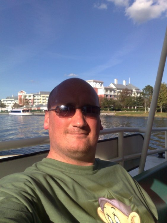 Ok, it's been a while since I signed up and posted here, and the one picture I used had a huge beer obscuring me, so here's some newer ones from this month in Orlando. I get called Dopey a lot, cos of my bald head, blue eyes and big ears??? But he's cool so I don't mind! A photo sans beverage! On the boat between Disnet's boardwalk and DHS