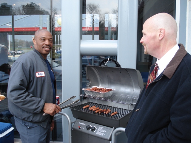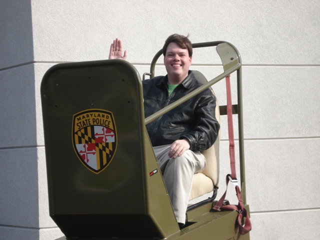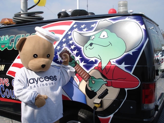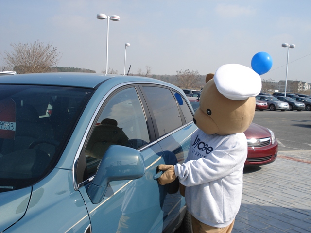 So what happens when you get a bunch of law enforcement officers, health department officials and Jaycees together at a car dealership on Maryland's Eastern Shore? Why, they host Safety Seat Awareness Day, of course! This was our (the local Jaycees) first time attempting this event, and it was a smashing success. Based on the number of Easter baskets we handed out, we were able to check about 60 vehicles for proper safety seat installation and give away a number of free child safety seats to replace those that had been recalled (usually without the parents' knowledge). As theme park season hasn't quite reached my corner of the nation yet, I thought I'd share a few scenes from today's festivities. As with similar event TR's I've posted in the past, I tried to eliminate the photos where kids' faces could be clearly seen, so you won't see too many children in this series. But trust me, the place was swarming with them for four hours today! And finally, I'm embarrassed to say my little sister thought of and executed this photo. (She's 26, but still....) Mascot fight! 'Sup? "Dancing With the Stars" it ain't. Worst. Air guitar. Ever. Although he did try to steal a car.... No, Carrie, Saul the Jaycees bear is NOT made out of Velcro! High five! Coming soon to a post office near you! Plus we gave away about a bajillion Easter baskets (OK, really about 60, but still...). And beer pong (without the beer). And ring toss... And hot dogs... We had bouncies... ...and we also got on TV! We got proclamations from the city and county... The local fire department brought its mascot-crotch-sniffing fire dog out to play. Ditto. Because mascots in crash test simulators are always funny. As president of the Jaycees, of course, I had to lead by example and take a spin on The Convincer. It was jarring, and I walked off with a little bit of a headache. I think it was made by Vekoma. The Maryland State Police brought this contraption, which simulated a 15-20 mph car crash. They called it "The Convincer," as in "I'll bet this convinces you to wear your seat belt!" This is what it was all about. A sheriff's deputy checked our first safety seat of the day. This wasn't so much to warn drivers to be careful as to let them know they had officially entered the Cootie Zone.