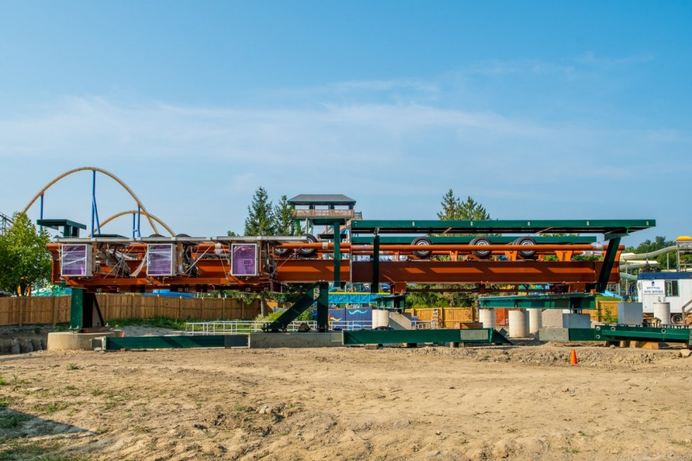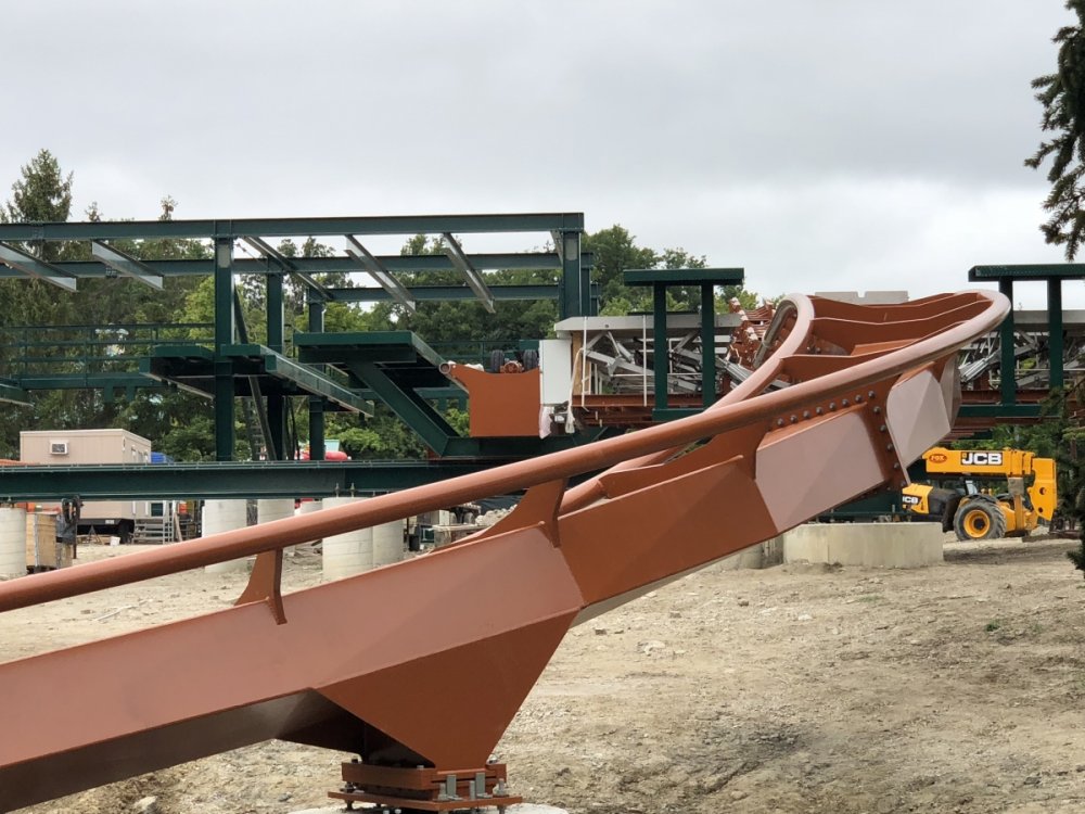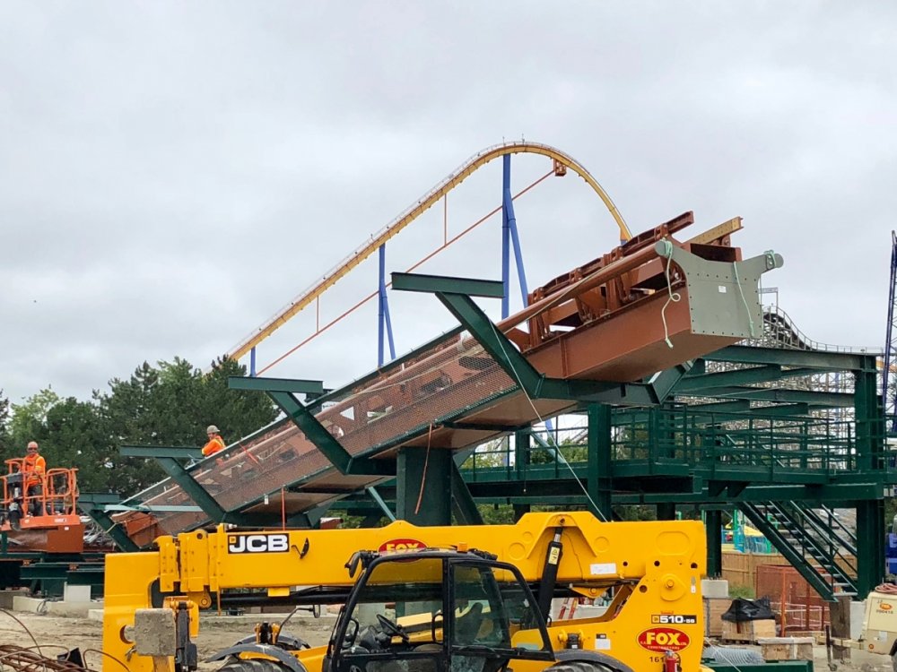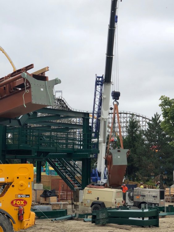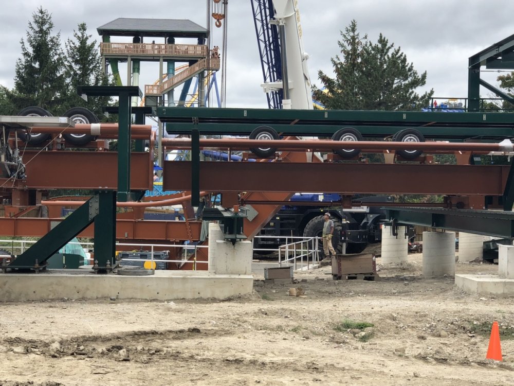Construction is moving quickly. I think the end of summer is making everyone squeeze in a last visit as the park was super busy compared to other summer days. Every queue was full and overflowing on to the walkways. Nevertheless, everyone seemed to be having a good time, if with a slight look on everyone's faces that summer is just about over. Is it really Labour Day weekend already? Nicman, that looks to be the general location of hotel. It will be facing highway 400 on the plot of land next to the CW highway sign. Here are some pics. Have a great long weekend, all! Looking forward to this drop out of the station. The base of the lift hill being, well, lifted, into place. Tilted into place and.. ..installed. Only up from here. Lift columns. Footer fun. (for the helix surrounding the walkway). Lift hill footer. Mine Buster queue. It's just a touch busy. Lift hill columns Vortex queue -