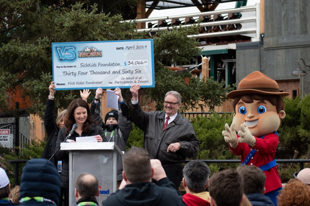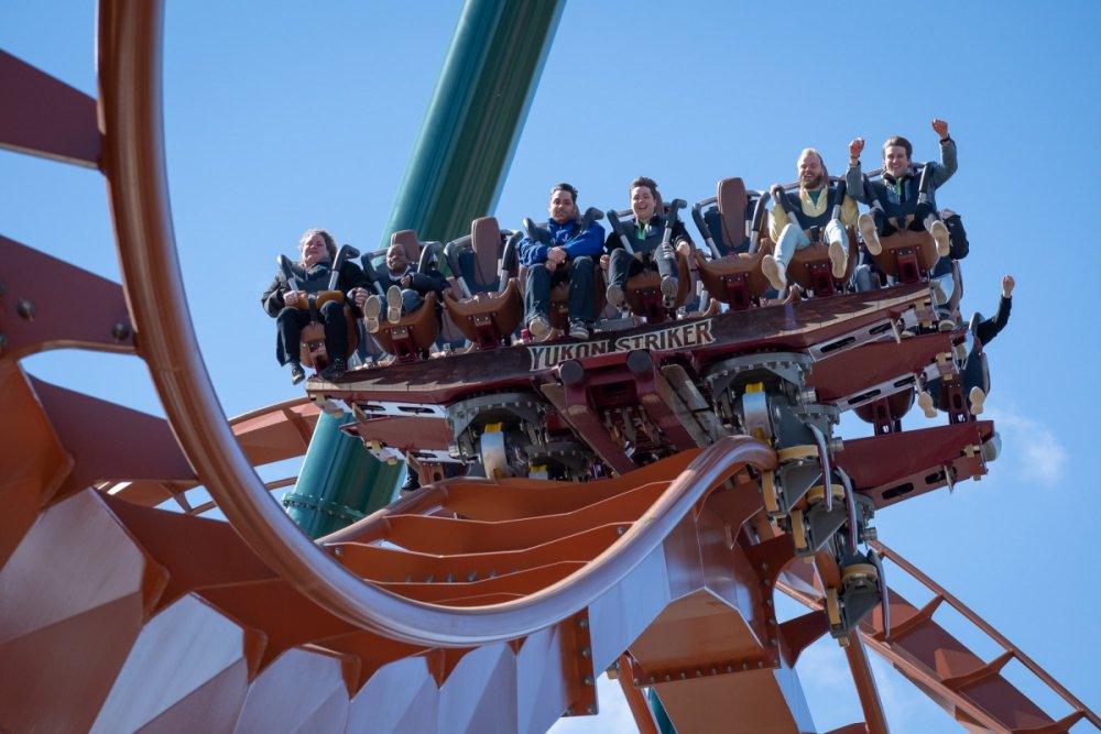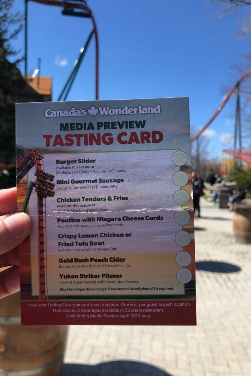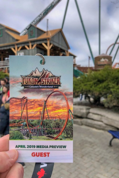 Yesterday, TPR was at Canada’s Wonderland to preview Yukon Striker, the world’s tallest, fastest and longest Dive Coaster, designed by B&M. With a 245 ft drop, the ride is a fantastic complement to the park skyline, along with its distant relatives, Behemoth and Leviathan. 72 lucky raffle winners, who participated in a fundraiser for Sick Kids Hospital in Toronto, were the first of the public to ride. The fundraiser raised $34,000 in support of children’s medical research, education and building a new hospital. Judging from the reactions and huge number or re-rides, Yukon Striker is already a hit. Congratulations to Sick Kids and Canada’s Wonderland on this fundraising initiative. I'll post separately about this event. Yukon Striker, and its Yukon goldrush theme, is the anchor to a new themed area of the park, Frontier Canada, which was originally planned to be built in the early 1980s. It goes to show that it’s never too late to follow through on great ideas. From the food selection, theming, rides, characters and more, it’s a very refreshing and distinct area to enjoy while walking through the park. There’s no shortage of theming details to check out. As for Frontier Canada’s halo attraction, Sophie Bolliger, Vice President & Head of Sales at B&M, explained to TPR what makes Yukon Striker so unique. In addition to having the first loop ever on a dive coaster, Ms. Bolliger highlighted the dive through Vortex in a 200ft length underwater tunnel, a dive through a second tunnel, two Immelmanns, a zero-g roll and a dynamic spiral as a surprise ending. “I think what is also very unique about Yukon Striker, is that it was custom designed for Canada’s Wonderland. It has a great variety of elements”. After riding twice, once in the middle and once in the front, it is both familiar and unique. For anyone who has been on a dive coaster, the dive, impressive look of the ride, width of the trains, smooth ride, relative short length and re-rideability, will all be familiar. It’ll be instantly unique once seeing the breathtaking view looking over Vortex and down into the underwater tunnel. Yukon Striker is special in its use of the terrain, combined with riding through the course of a ride so massive in scale, when you consider the track gauge, train width and how high the inversions are. All of the inversions, in particular the zero g roll, are fantastic and above all, super smooth. Sure, the park has lots of inversions, but these are a first—Smooth ones! Yukon Striker is a great addition to the classic loopers at the park. Guests are going to love it. There’s no doubt that this ride will be an instant landmark and hit. Enjoy the pictures below. Be sure to check out TPR's YouTube and Twitter channels for video. More video coming soon. Park Information: This Friday, April 26, is Season Passholder Preview Night, from 5:30pm to 10pm. The park opens for the 2019 season on Friday, May 3. Let's do this. Time to check out the world's tallest, longest and fastest Dive Coaster! No one can really work on an empty stomach. A great preview of new food offerings in Frontier Canada. Majestic. It's testing. No chickening out. Frontier Canada, in the original design of the park, is finally done and it looks fantastic! Gold, huh? The station is really well done. Before the 72 raffle winners get to ride, we hear Jack's inspiring story. He is a Sick Kids patient, cancer survivor, ambassador and a huge coaster fan! The fundraising effort means the world to Jack, and every patient, at Sick Kids. A little peak at the conveyor system that will carry bins full of our stuff over to the ride exit. First public train out with Sick Kids Hospital fundraisers. How's the ride? Just take a look at the faces n the next series of pics. Underwater time! Watch your head! You'll fly through a 200 ft long tunnel in under 2 seconds! Falling at 90 degrees Bunny hop before the spiral. My homage to SkyRider. It's going to be a great season. -