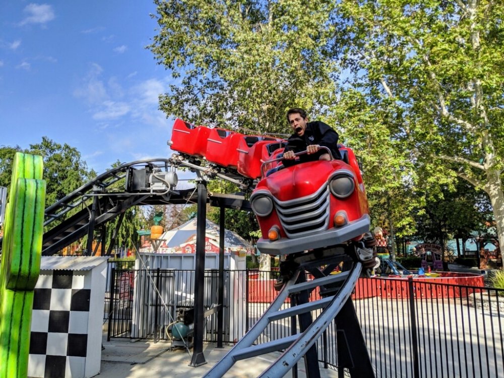 This afternoon I drove up to Valencia to check out Six Flags Magic Mountain’s latest thrill machine. Crowds are usually pretty light this time of year, but seeing as this is the park’s newest ground-up coaster, I didn’t know what to expect queue-wise. Fortunately, I must’ve chosen a great day to visit—when I arrived at the ride, there wasn’t a single other person in line! Excitedly, I ran up the entrance ramp and made my way to the front of the station. The ride op gave me a suspicious look (yes, some of us have weekdays off...give me a break?) but then proceeded to open the gates. I took a seat in the front row, pulled down my lap bar, and was off on my zen ride! The coaster begins with an impressive 399cm lift hill. As you approach the top, you can see a portion of the surrounding area, but the chain moves too quickly to enjoy the view for long. Suddenly, the train is pulled to the right and dives toward the ground at a slight bank! This first drop reminded me a lot of Expedition GeForce’s—though I may not remember that one very well. The coaster then continues to the right as it rises into the second hill. As the train crests the top of this hill, you experience a pop of almost-airtime. Crazy! You descend again, this time twisting through a 360 degree helix, gaining speed as you approach the earth’s floor! This may be the most forceful part of the ride. Exiting the helix, the train traverses a straightaway element—similar to the one near the end of Millennium Force—where riders can truly appreciate the sense of speed. Then, the coaster rips to the right again, dropping slightly as it does, sending riders flailing into the side of their cars with insane lateral G’s! The train continues curving right, up, and into the station, and SLAMS into the brakes, showcasing the sheer power of the coaster. Wow. What a ride. The operator asked over the speaker system if everyone would like to go again, but seeing as I was the only one on the train, I decided once was all I can handle, so he released the lap bars and I made my way to the exit. I’m not great at rating systems, but let me just say that Speedy Gonzales Hot Rod Racers is one hell of a ride. The onride photo booth is difficult to locate because it’s not marked and the employee doesn’t wear a uniform, but fortunately he found me and was able to sell me this picture for $20. What a Six Flags Day!