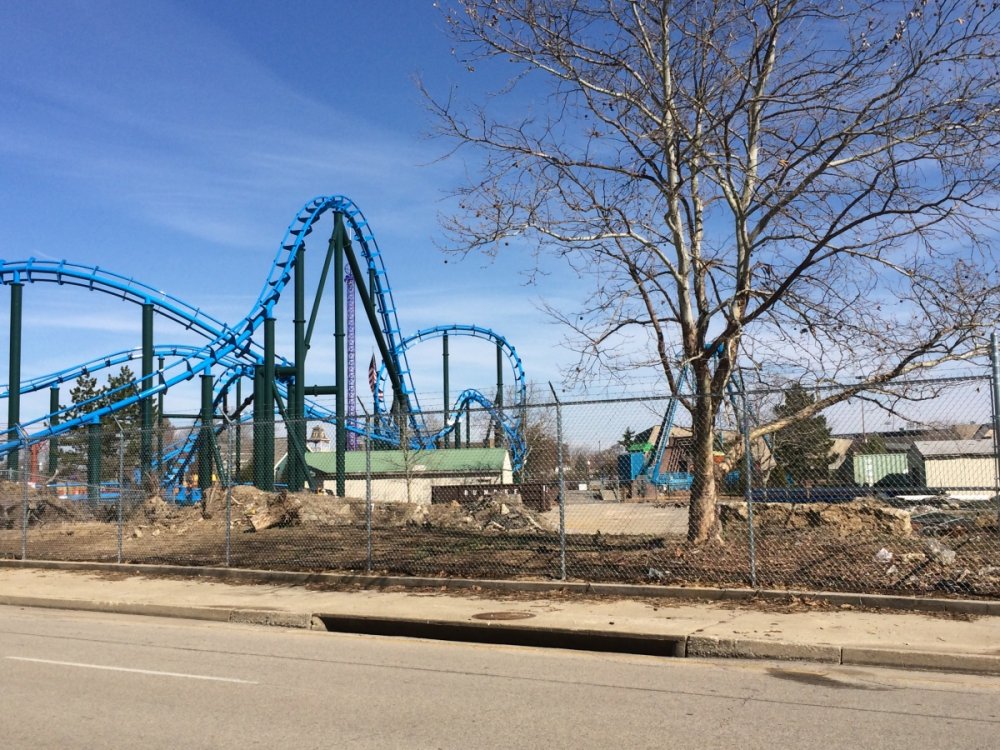 Took a drive by the park the other day. Enterprise is fully assembled and ready to go. This new Zamperla ride now resides in Rainbow's former location. The location where Cyclos will be is still vacant. Skycatcher is now complete as well! Interesting placement with this one. The dragsters are now gone, but Greezed Lightnin's train is still on site. -
