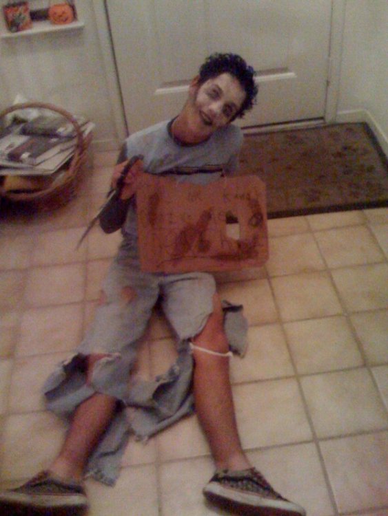 Here's my costume! A Close up of me. Me as a Dead Hobo. The sign says "Give me candy or give me death!"