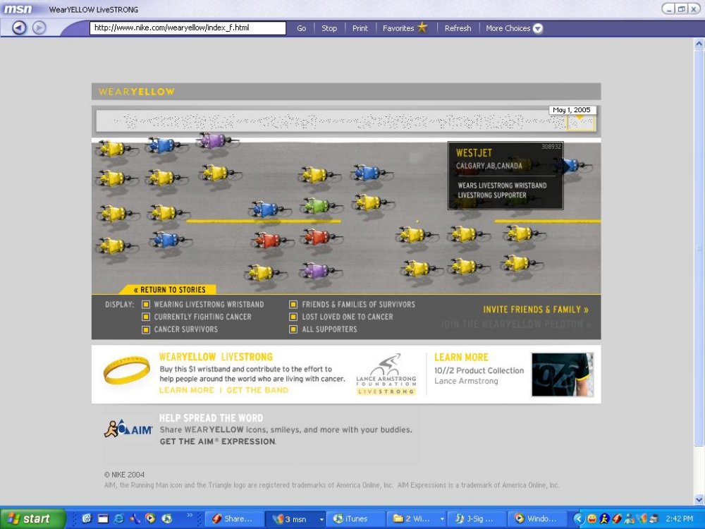 The yellow bracelets are all over.... If you go to www.wearyellow.com there is a thing called the Peloton, and you can sign up to have a cyclist represent your support. If you already have, show us a screenshot of your cyclist. If you have a bracelet but haven't signed up... do! If you haven't got a bracelet, go get one! Here's mine... I'm apperantly losing, Lance is way ahead. My guy on LiveStrong.
