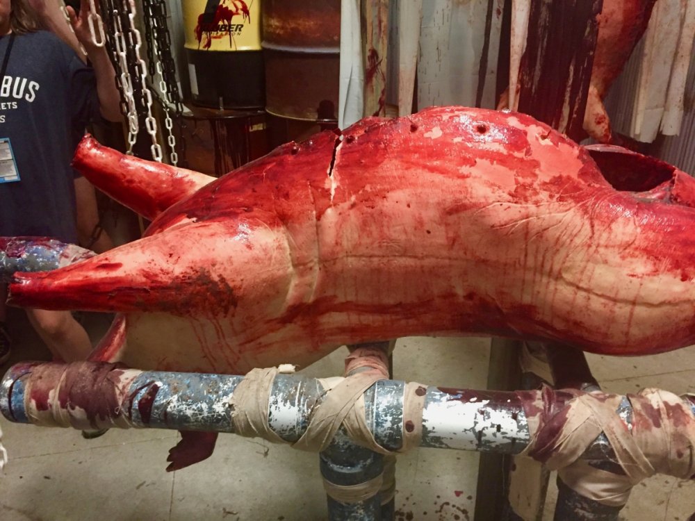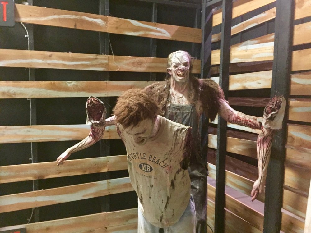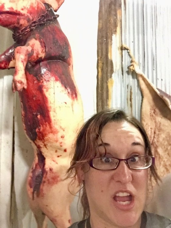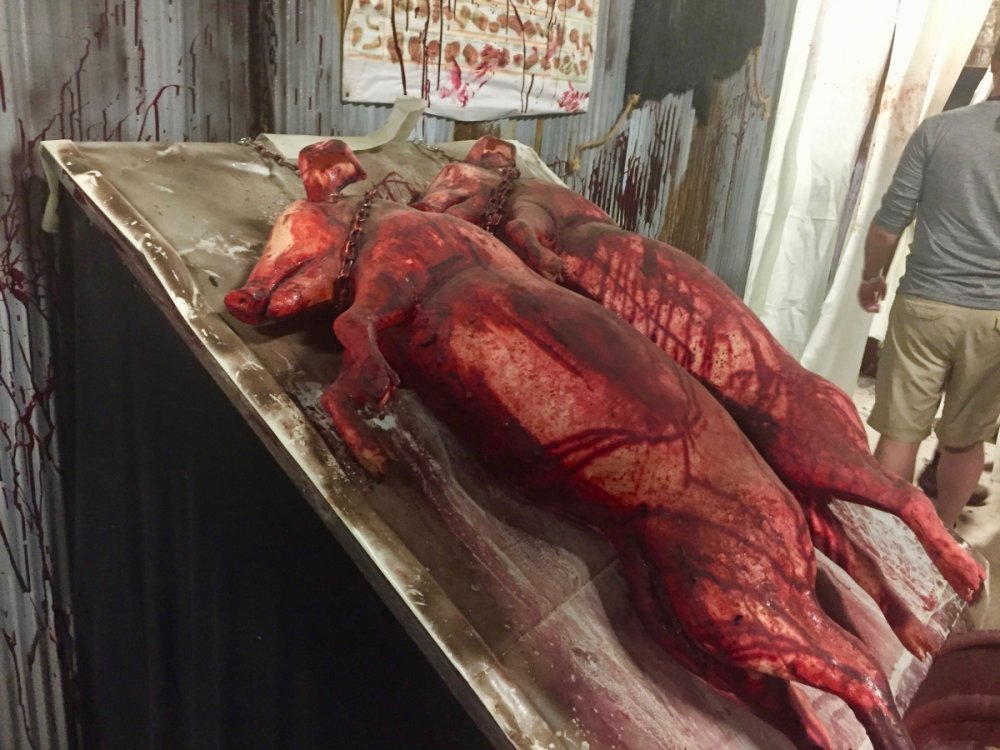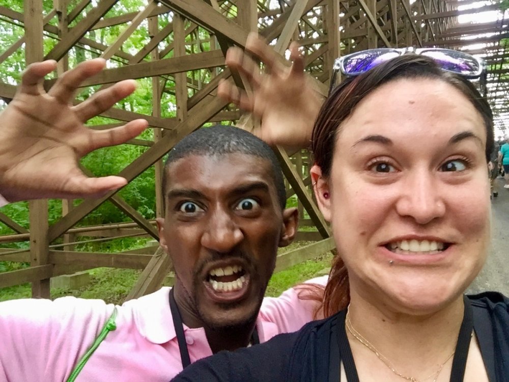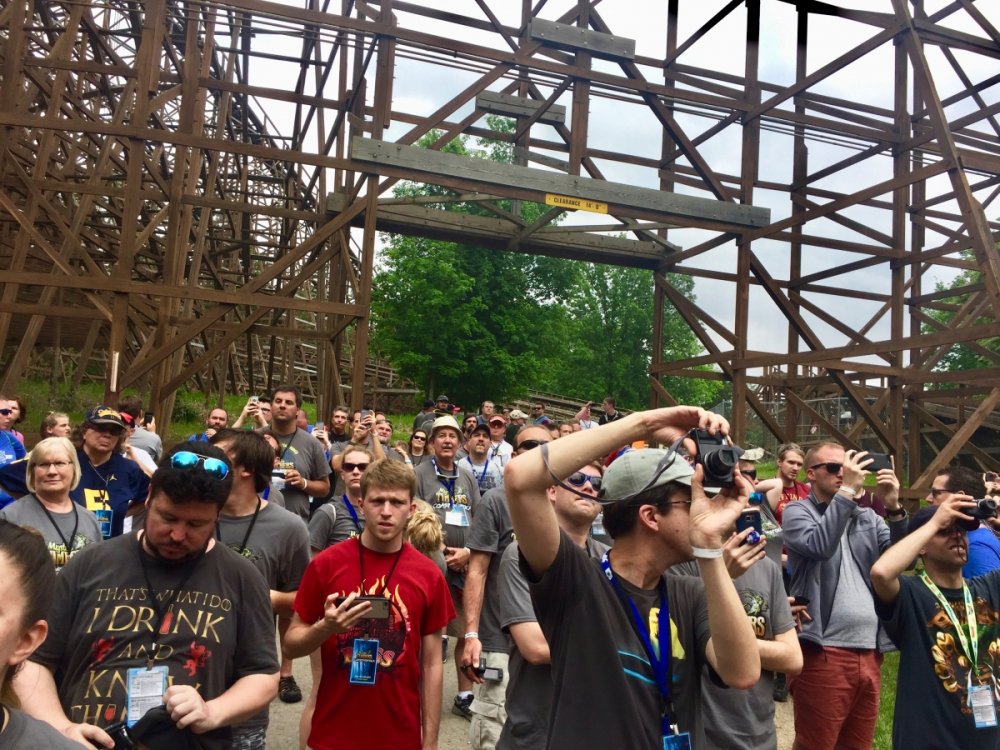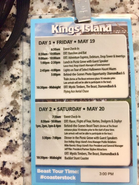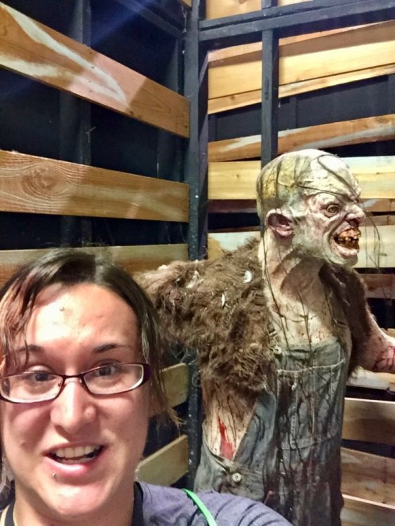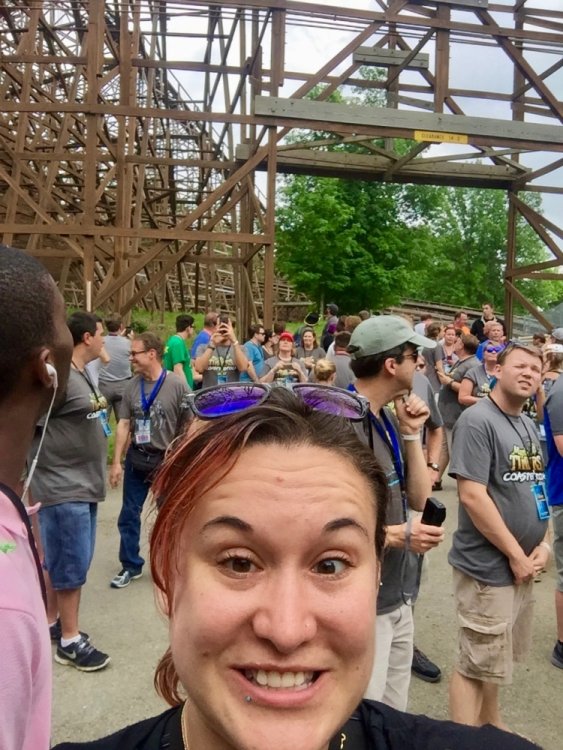 I thought for sure someone would have posted a Coasterstock TR so I could sit this one out (since I'm really a sporadic photographer and not the best at relaying everything that happened throughout the day). However, since no one has done it, I'll post my photos and mention the highlights. Day 1: Friday May 19. -6:30 check-in begins, but since we drove from an hour away and wanted at least some amount of sleep, we didn't make it until around 8:00, which meant we wouldn't get to the 8:30 ERT until almost 9. Our fault. They did have coffee and donuts for us, but our fault for not making it earlier to relax and enjoy it. -8:30-10:00 ERT on Banshee and Bat, then starting at 9:00, Delirium, Drop Tower, and Invertigo. Adventure Express was supposed to be one of them, but I don't think it actually opened during ERT. We were able to get a ride on it pretty soon after the park opened, however. There were too many rides to choose from! We ended up riding everything about once or twice, but our time could have been spent marathoning Banshee and it still would have been great. -1:00-2:30 lunchtime. We heard from Logan Joiner and his father, founder of Koaster Kids. Logan grew up with severe autism and had developmental troubles, but once he found roller coasters, he started to feel more brave and became a whole new kid at home and at school. He began opening up and getting excited about roller coasters. When he began filming for Koaster Kids, he received a huge amount of support from individuals all over the world and kids who could relate to Logan who were inspired by him. One kid, from a war-torn area of Israel, even said that if Logan can be brave and ride roller coasters, then he can be brave and go to school every day. It really was a great story and I'm not doing it justice, you should check out his channel, youtube.com/koasterkids. Next, Lance Heal, King's Island's Manager of Entertainment spoke. He talked a little about Haunt and shared that a maze would be leaving this year, and we would also see something new. Also, they would be focusing on bringing in more backstories for some of the mazes that previously didn't have them. They were also working to acquire animatronics for some mazes, including Blackout and I can't remember the second, it may have been Slaughterhouse. He also talked about Winterfest and couldn't share which rides would or would not be open, but shared that they are working with the rides maintenance department to get that sorted out. He talked step-by-step about what Winterfest would look like. I just remember they said it would be similar to CGA Winterfest, that the ice skating rink on the pond would be a bit bigger, and that preparations are already underway to prepare the main plaza for the giant tree and other decorations. Now, during both of these speeches while everyone was enjoying burgers and hot dogs, I was working with the staff to get a veggie burger, which eventually arrived but took a long time. So, regretfully I missed some of what was said, or was too busy enjoying my veggie burger when it finally arrived to catch every detail that was said in the speeches. I am thankful to the staff for accommodating me, but I do wish they had had a vegetarian option on hand and I didn't have to wait 30+ minutes for them to go find one and bring it. 2:45-4:00 pm we took a lights-on tour of Slaughterhouse and Blackout. I wish could have taken our time in the mazes more, as I felt pretty rushed. They told me at Blackout they didn't mind if I shared photos of the interior of the mazes, so I'll share the rushed photos I did take. It started storming not too long after this, so the 5:00 behind the scenes photo op. of Diamondback had to get moved. My group ended up taking shelter at the bar by the pond. Apparently, nowhere was selling beer until 5:00, but it was still raining by 5:00 and we were able to get a couple beers and stay in our shelter. It's darned expensive, but oh boy did I want it. Eventually, it stopped raining and the park was DEAD, so we got a couple pre-ERT rides on Beast and Mystic. 10:30-Midnight: ERT on Mystic Timbers, Diamondback, Beast, and Flying Ace Aerial Chase. We rode all of the former 3, having the most rides on MT in the end. We already knew Beast night rides are the shizz, but Mystic Timbers night rides are AMAZING as well! Like I seriously had a hard time deciding between the 3 which coaster I wanted to ride at any given time (since I love Diamondback at night as well). Good thing they're all close to each other! Okay, here are some photos. It got really hot, so D. and I decided to ride "Race for You Life, Charlie Brown!" and both sit in the front....this was the result. Taking a photo with Snoopy was one option for the scavenger hunt! Lights-on tour Rawr IIRC there was a moving saw blade in here. During this whole tour, the kid behind me kept saying, "I'm going vegetarian now!!" Good thing I don't eat bacon On the roof Animatronic Did I mention that I hate animatronics in Haunt mazes? They scare the crud out of me, so I always run past them as fast as I can. This is probably the closest I've ever gotten to this thing. "Do you want to play a game?" We didn't realize how demented this maze gets toward the end until we got to stop and really look at the props with lights on. Like seriously, WTF? So twisted....I LOVE it! So I have a history with this maze, and I was beyond excited to tour it. I went through it 3 or 4 times during Haunt, and it was one of my favorites. The first time I went through this, I entered a room and saw a tall shadowy figure. Right as I was looking at it, the lights flicked on and there was a crash and there's this HUGE tall scary thing right in front of me. I freaked! It was one of the best scares in all of Haunt. After the maze, I was going on and on about it, and the person I was with (DILinator), said he hadn't seen it! The next few times I went in the maze (and admittedly closed my eyes in the room by the third time), th