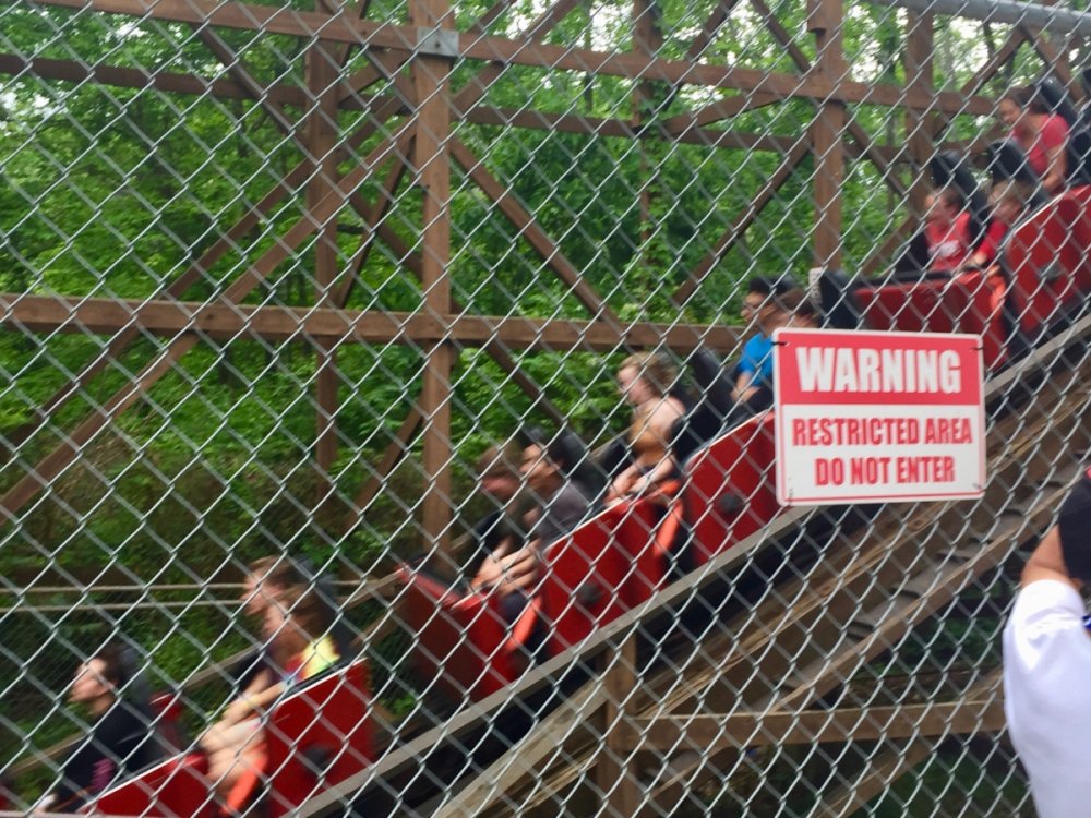 Day 2 of Coasterstock, Saturday May 20. We got about 5 ish hours of sleep, but we were up and at em the next day to get there around 8:00 again. 8:30-10:00 we had ERT on Racer, Flight of Fear, Vortex, Dodgem, and Zephyr. We rode everything except Zephyr and Vortex (since we already had rides on Vortex and...it's not my favorite). After having a rough couple rides on Racer and a few rattly rides on Flight of Fear, I remarked that today felt like the rough rides ERT day (besides Invertigo). Definitely felt like we finished what we wanted to ride pretty quickly even though there was still plenty of ERT left. It would have been nice to get on Firehawk, but we were able to ride it later in the day without much of a wait. It was cool to see Flight of Fear with lights on, but I definitely prefer it with lights off. 3pm we had our Beast behind the scenes tour. They divided us into 4 groups before we got to the event, 1pm, 2pm, 3pm and 4pm. One person had a later time and one person missed his earlier time, but staff was accommodating and let them go with us, so we had our entire clan on the 3:00 tour. The tour was definitely a lot shorter than I thought, and I thought we would go further out, but it was still really cool seeing Beast from the back areas and getting some neat photos as well as hearing some Beast trivia. Also, it started to rain again so if the tour had been longer, we would have been getting wet. We witnessed some people stall on the second lift, and they were shouting at us as we photographed them. 5:00 we met up again to get our Diamondback photo op. We went onto an area of grass on the other side of the big former Tomb Raider building where we could get some nice views of Diamondback. 5:30-7:00 we had dinner, and I faced the same problem from Friday. BBQ pork sandwiches, BBQ chicken, mashed potatoes, cole slaw, and canned green beans. Not wanting to eat mashed potatoes and a bit of cole slaw and canned green beans (since I'm not a big fan), I asked if they had something vegetarian again. They eventually brought me another veggie burger much later (after forgetting about me twice), but I was still thankful to have something besides just mashed potatoes (which were actually pretty good as far as mashed potatoes go). Jeff Pike, President/Partner of Skyline Attractions and designer for a lot of GCI coasters gave a really great speech about how he got into the business and what went into designing Mystic Timbers and a lot of our other favorite GCI coasters. He talked about how Dick Kinzel didn't like wooden coasters and didn't want GCI at Cedar Fair for a long time, but now we have some really great GCIs at CF parks including Prowler, Gold Striker, Renegade, etc. Really, I can't do this guy's speech justice at all. He was a wonderful and entertaining speaker, down to earth, and inspiring to anyone interested in roller coaster design (which happened to be a lot of the crowd). We also heard from Mike Koontz, King's Island's Vice-President and General Manager. He used to be CEO of Paramount Parks, but lost his job when Cedar Fair bought everything. He recently got called to work at Kings Island again. (If I am mixing something up, please correct me or if you have anything to add that I missed). He shared about what goes into being GM of a theme park and then took some questions. Next, Don Helbig, King's Island's Area Manager Public Relations who put Coasterstock together for us and briefly spoke to us. We then had until 10:30 before ERT would start. By now, we were pretty exhausted, and just kind of meandered around the park waiting for ERT and riding things here and there (when there weren't long lines). Toward the evening, just before the fireworks, the weather took a turn for the worst. POURING rain, thunder and lightning!! We got to watch the fireworks show with lightning in the background, but not for long, because it started pouring right after that. We huddled out with other Coasterstock people by the bar again. Everything closed, except the Pirate Ship which never seemed to close in the weather. ERT was postponed until the weather improved. Eventually, security came over to us and told us to, "Go under the Eiffel Tower because we're clearing this side of the park." Not sure why they thought standing under a giant lightning rod in a lightning storm was a good idea, plus it wasn't waterproof at all, but about 10 of us decided to try. Wet and miserable huddled together under the tower, security came by again and told us to find shelter closer to where our ERT was. We made a run for it and ended up under some umbrellas by the Chick-fil-A. We were seriously starting to wonder if ERT was going to happen, and we were soaked and cold, but the posts on the Facebook page during this time were hilarious! One person asked for lights-on Boo Blasters, someone else followed up with a request for Diamondback lights on, another person posted a Snoopy meme of Snoopy lying bored during a rainstorm, people posted about all the random places they were waiting out the storm with other Coasterstock people. It was a weird bonding experience. About 11:30 we saw....DIAMONDBACK TESTING!! Still raining pretty hard, we rushed over to Beast. Our friends made it to the front row before us, which ended up a blessing in disguise. Super wet soaking cold Beast night ride with rain pelting our faces, but we loved every second of it! After a thorough soaking, the rain lessened and we got another less wet ride on Beast. It was HAULING!! Without much time left, we finished the night at Mystic with some of the best night rides ever! Also had some great shed clap and dance parties. Overall, a really amazing (but exhausting) weekend!! I already miss it and can't wait until I can go again. Now, the rest of my photos. Diamondback on the way to the rapids ride "Hey! I see you up there. Just what do you think you're doin'? You kids go home to your video games! This place is not safe!" This coaster really has a wonderful l