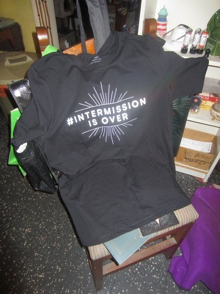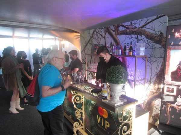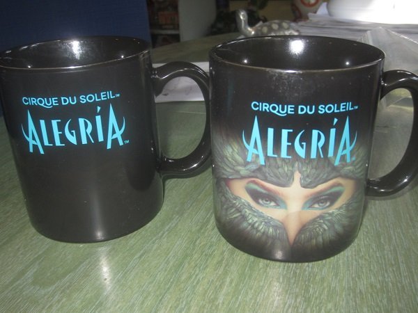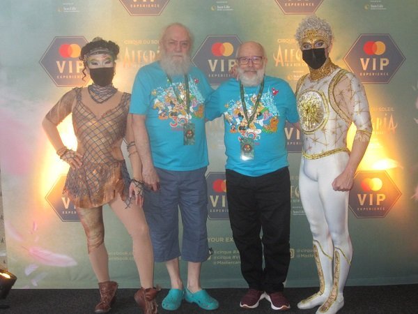 22. Cirque du Soleil ~ ALEGRIA ~ Friday, April 22/22. We took a taxi downtown to the Cirque chapiteau (i.e. tent), and several minutes later, we were having our "VIP Experience" there. Separate entrance for us, food, food, food everywhere, and an open bar too! There were also separate bathrooms for us, and a lovely outdoor patio-style for us to enjoy. Which we did, pretty much all the time we were there, before the show started. And we were there during Intermission as well. It was so laid back, I kept wondering if this was the way to do, from now on. "VIP" I mean. And during the time we were there, everybody was so happy for us and our Anniversary, spending it with them! All the crowd there got free programmes and a very unique umbrella, when we left. But for us, somebody was kind enough to put a HUGE swag bag together for us! Which included the CD soundtrack, a DVD of the original 1994 production (filmed in Australia), t-shirts, coffee mugs .... we figured we had been given over $200 worth of souvenirs! Sweet. Obviously we couldn't take photos of the show itself, so these are all pre-show shots in the VIP "tent." And the souvenirs we got. We wore our "Happy Masks" to the show, but didn't need them once there. Here we are! Sponsorship wall. Where we're heading to. A closer look, before we went inside. Not sunlight, but a light from below Downtown is so close to us, here. David getting his first cocktail (of several we had). And if not finished, we could take our drinks with us for the show! Like I said ... a lot - of - food for us! Including this wonderful soup they were serving, besides all the appetizers. What we started with. To be sure, we went back for more, and during Intermission as well. A really nice outdoor patio area created for us. And not many went out here. Most stayed inside. Silly VIP-ers. Two cast members came to visit, for photos with us. Hot Pink Lights on = Time for us all to head into the Grand Chapiteau, for the show! Our view from our seats. Pardon the fuzzy shot. Souvenirs 'R Us! The bag had the original Alegria logo and image on it - and the current one on the reverse side. Programme, CD, and DVD of the 1994 show. I already had the original DVD, so I may gift this one to a friend. Mug left, cold ~ Mug right, hot coffee in it. Kewl! And the t-shirt which pretty much says it all, about LIVE stage shows, now getting back to business of touring etc. Thanks for all of it Cirque!