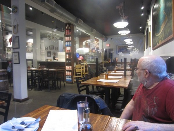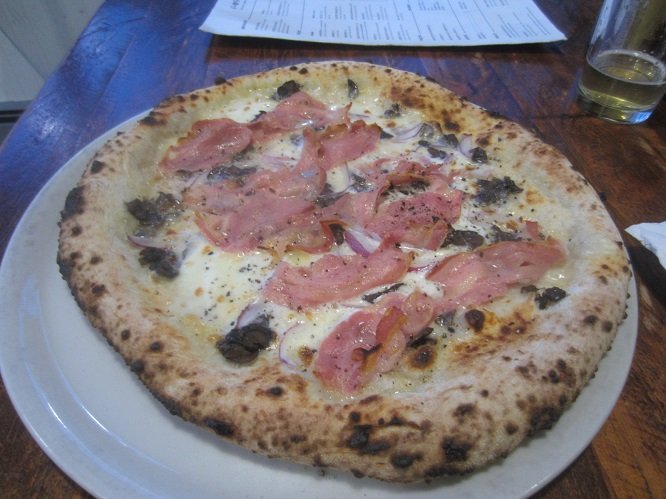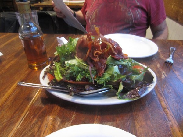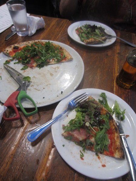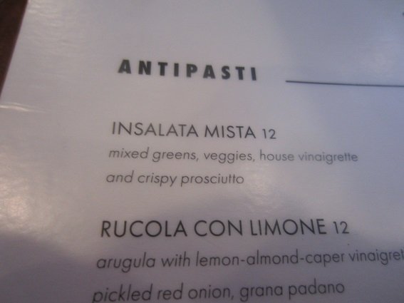 ^ We love black olives on our pizzas, too. And those onions on the first pizza, are definitely red onions, yes? Hadn't had them on a pizza in a while. I do love their 'spiciness' especially when on a pizza! And I might as well post the pix here, from me treating David to an "afternoon meal" Pizza-style, yesterday. We had a salad beforehand, something I never order on my own, since the pizza is usually ALLLLL MIIIIIIINE! And combined with what pizza David chose, it was definitely a prosciutto kind of meal! Insalata Mista is what we ordered to split. I never sit looking into the restaurant itself. But with David in my 'usual spot', I got a new view of the place. And the people came in very early, rather than a bit later on. A lot came in after we did. What David picked for us. Note the prosciutto, there? The salata arrives. Definitely crumbly bacon-like prosciutto on top. We loved it! Last shot. I enjoyed it, but I still felt it was too.... uh .... leafy for my taste? Nonetheless, great meal for us both, and one we hope to repeat in the new year!