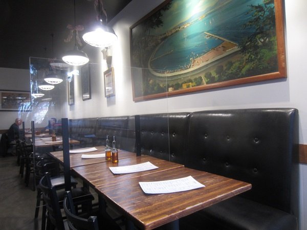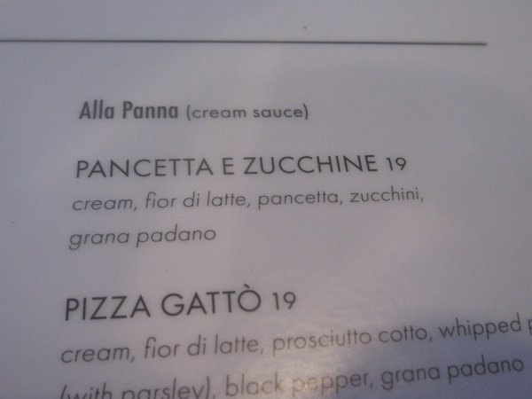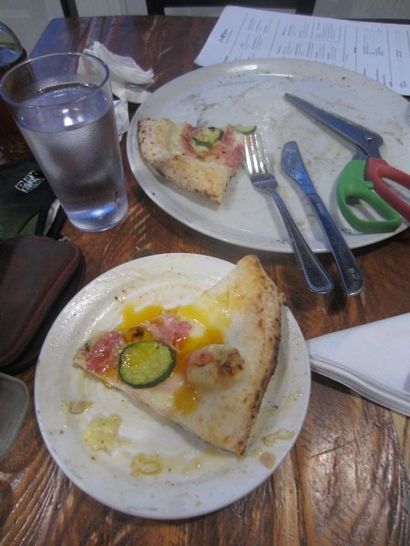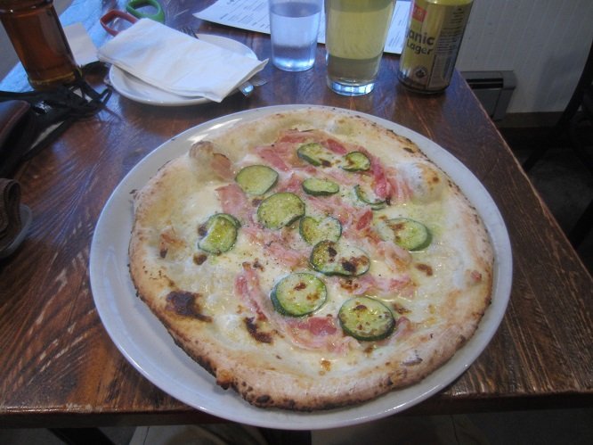 11. December 8th - Back to the Cream Based Pizzas! This time, it's the 'Pancetta E Zucchine' pizza. Still great, a second time around. The sky looks nice some times, around sunset time. As written on La Menu. Only two other people here, right now. A bit later on, it got really busy with more arrivals. Trying to be 'fancy' with the oven's fire reflected in the front window. Ta daah! Looks great. Tasted even better! Last bites. And as usual, one slice for David.